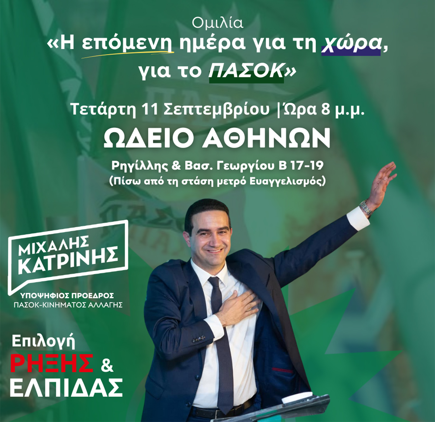 Την πρόταση του για τη Μεγάλη Παράταξη και το ΠΑΣΟΚ της επόμενης μέρας, θα παρουσιάσει ο Μιχάλης Κατρίνης, την Τετάρτη 11 Σεπτεμβρίου, στις 8 το βράδυ στο Ωδείο Αθηνών.