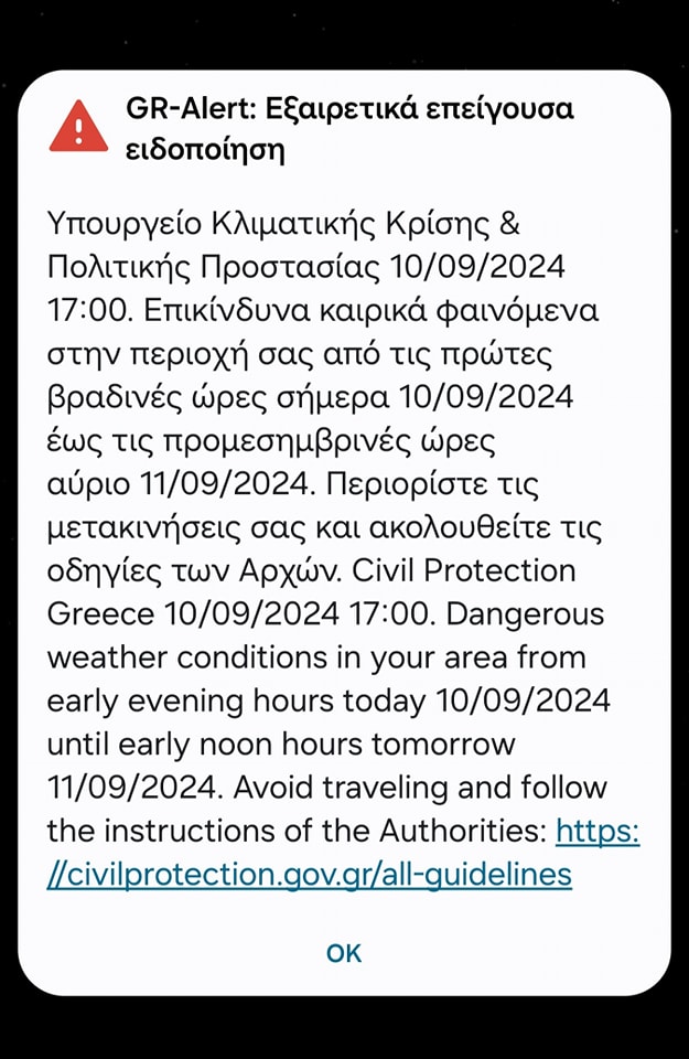 Το μήνυμα αναφέρει πως αναμένονται επικίνδυνα καιρικά φαινόμενα στην περιοχή από τις πρώτες βραδινές ώρες της Τρίτης μέχρι και τις προμεσημβρινές ώρες της Τετάρτης και ζητείται από τους κατοίκους να περιορίσουν τις μετακινήσεις τους και να ακολουθήσουν τις οδηγίες των Αρχών.