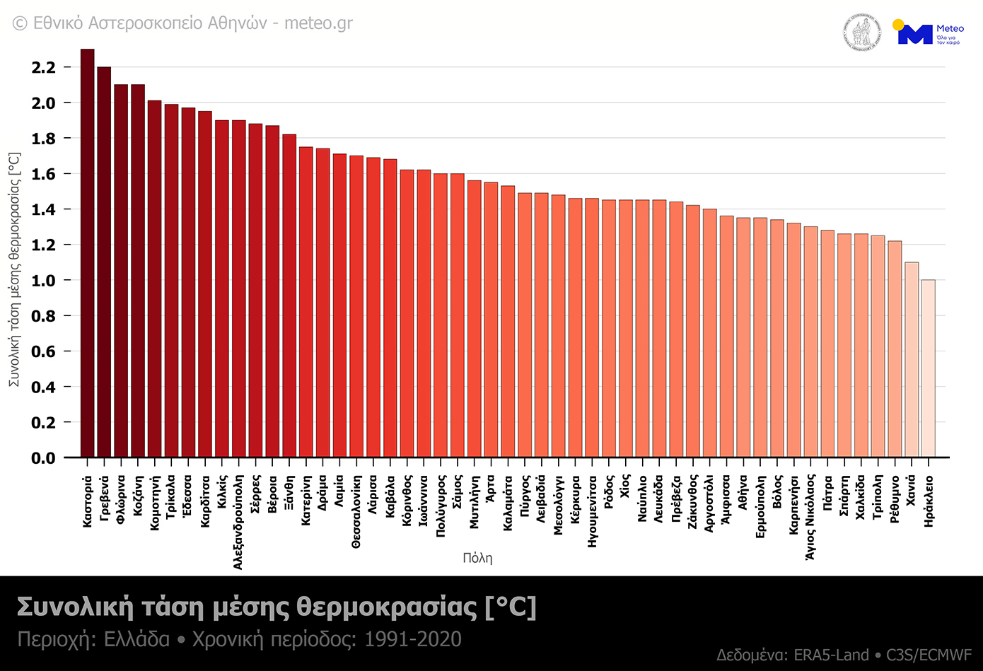 Για σύγκριση, σημειώνουμε ότι στον πλανήτη η μέση θερμοκρασία έχει αυξηθεί ~0,6-0,8 °C κατά την ίδια περίοδο, ενώ στην Ευρώπη κατά 1,2 βαθμούς.