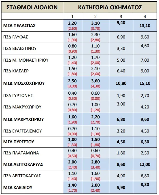* Μείωση ύψους 5% για τα βαρέα οχήματα, αποκλειστικά με χρήση πομποδέκτη οποιασδήποτε Παραχώρησης