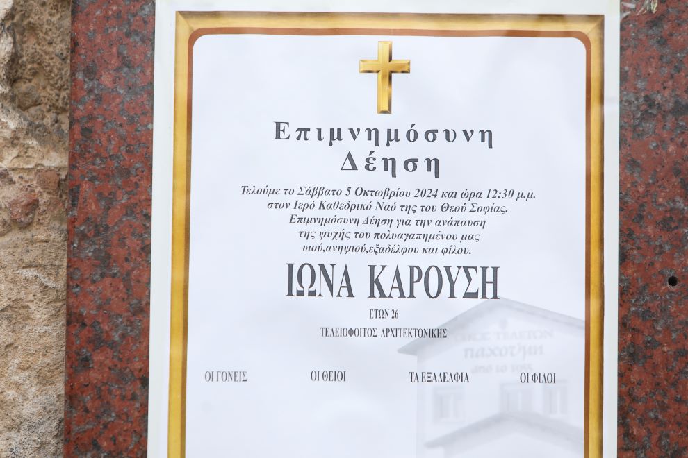Σε κλίμα βαθιάς συγκίνησης πραγματοποιήθηκε το μνημόσυνο για τον άτυχο Ιωνά Καρουση το μεσημέρι του Σαββάτου στον Ιερό Ναό της του Θεού Σοφίας προκειμένου οι δικοί του άνθρωποι που δεν κατάφεραν να μεταβούν στην Ιερουσαλήμ για την κηδεία, να πουν το τελευταίο αντίο στον Ιωνά.