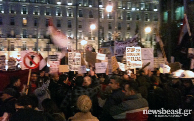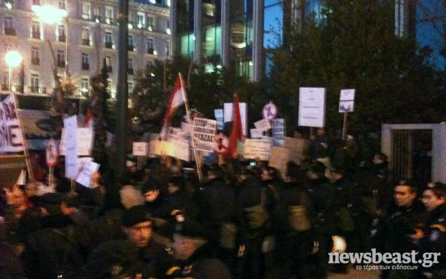 Άνδρες, γυναίκες και παιδιά κρατούν πανό και σημαίες και φωνάζουν συνθήματα κατά της κυβέρνησης Μουμπάρακ, καλώντας τον να φύγει από τη χώρα. Επί τόπου βρίσκονται δυνάμεις των ΜΑΤ, ενώ κλειστή είναι αυτή την ώρα η Βασιλίσσης Σοφίας.
