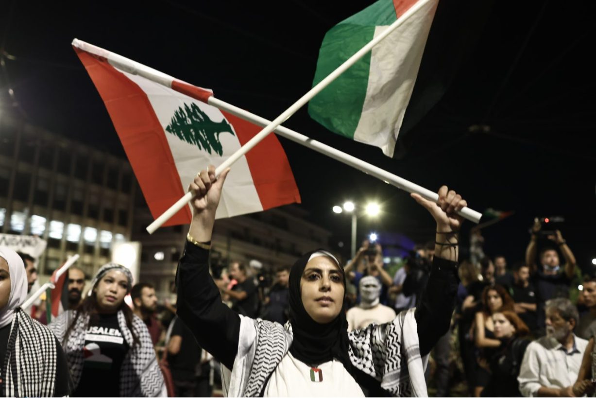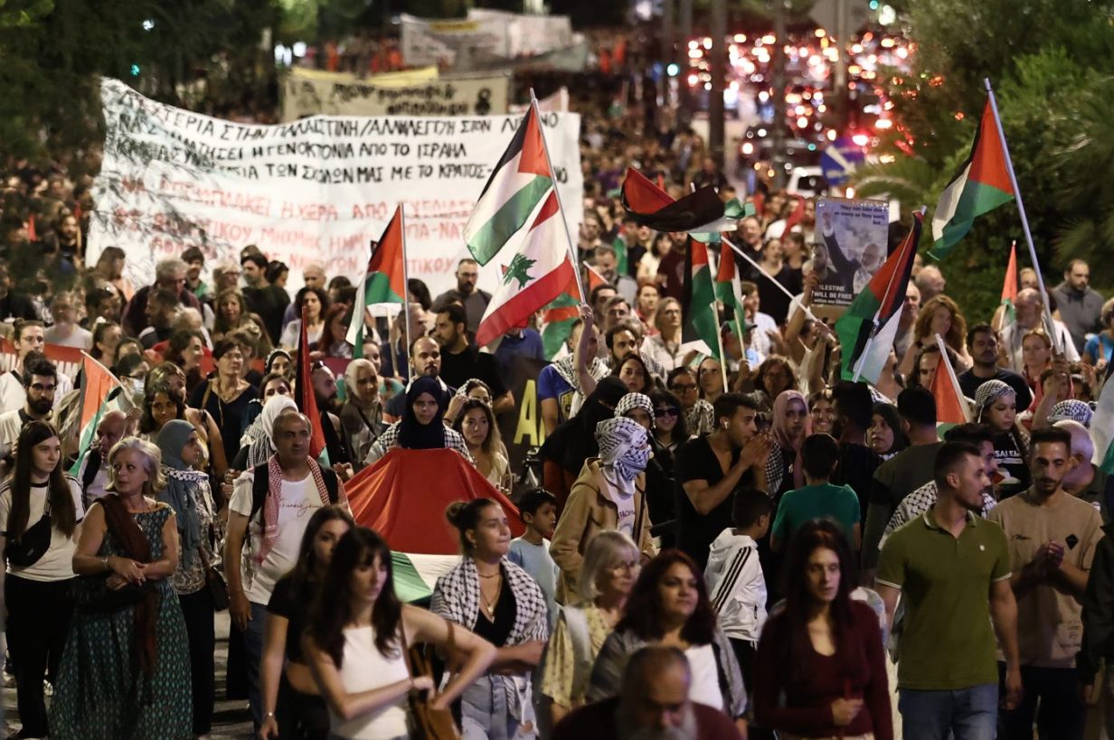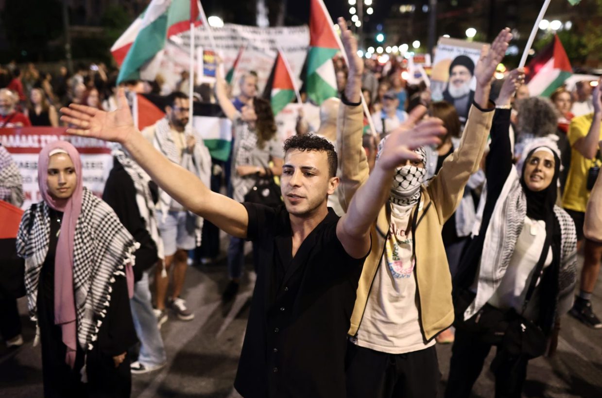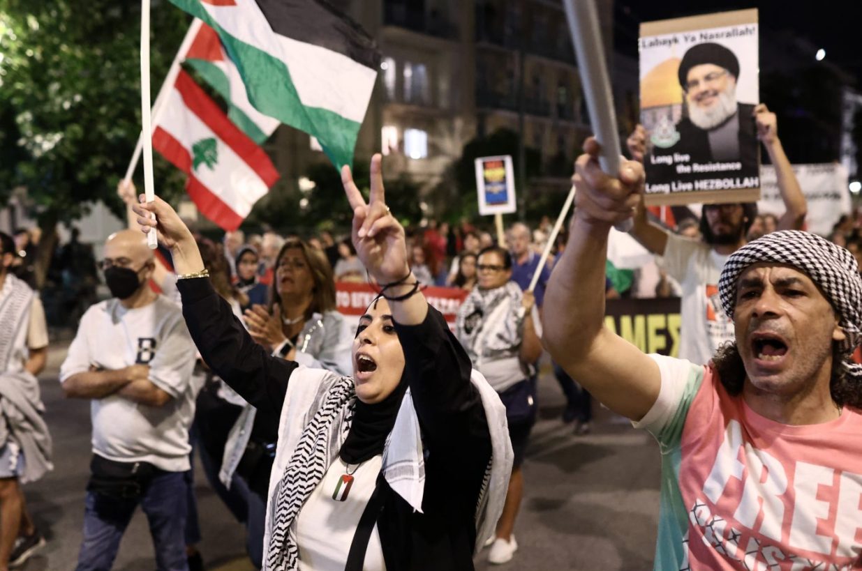 Οι διαδηλωτές εκφράζουν τη διαμαρτυρία τους φωνάζοντας συνθήματα κατά του Ισραήλ και των Ηνωμένων Πολιτειών, απαιτώντας τον τερματισμό των επιθέσεων στα εδάφη της Παλαιστίνης και του Λιβάνου.