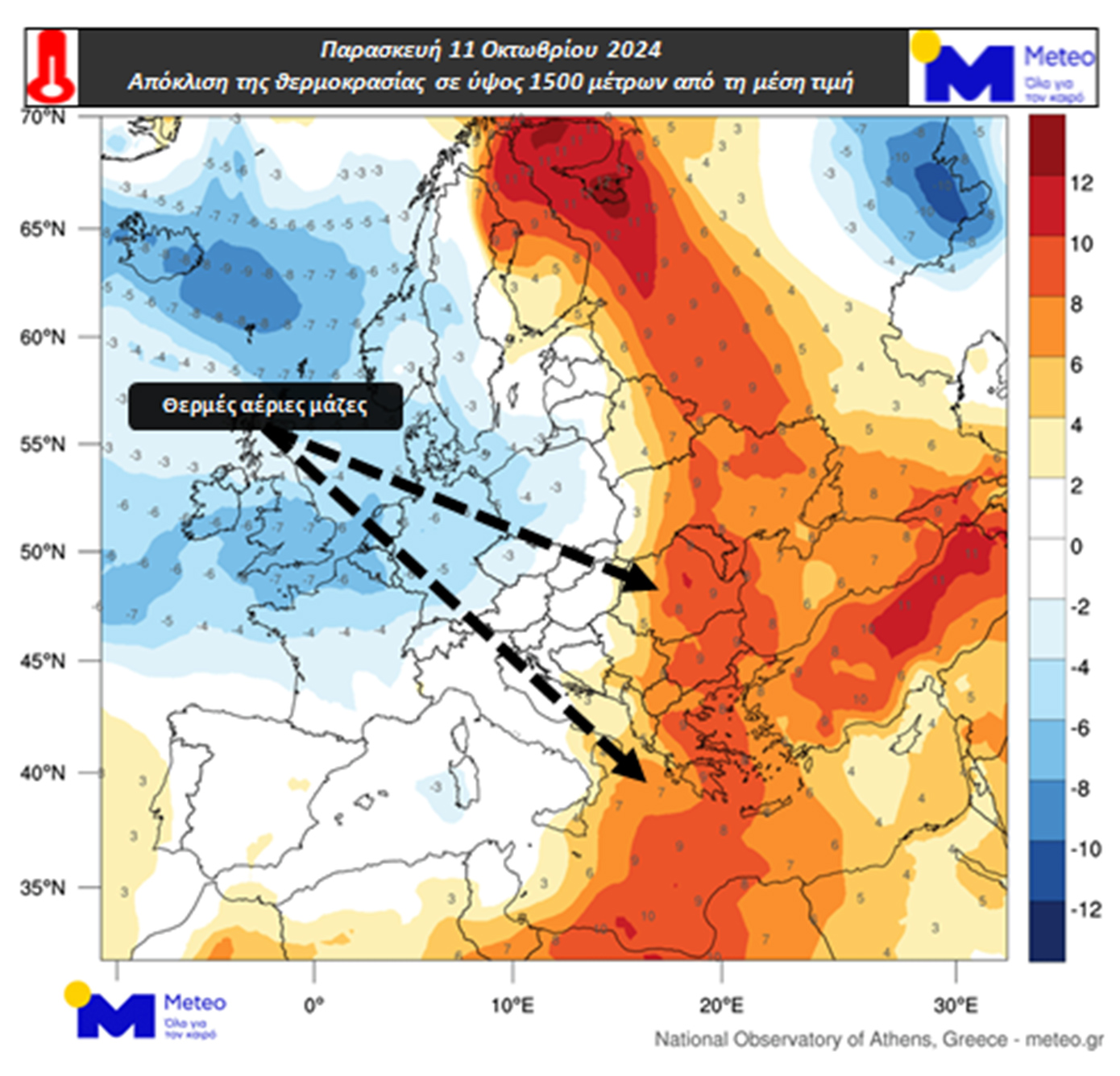 Στους παρακάτω χάρτες παρουσιάζεται η απόκλιση της θερμοκρασίας σε ύψος περίπου 1500 μέτρων από την μέση τιμή της περιόδου 1979-2010 για το μεσημέρι της Τετάρτης 09/10 και της Παρασκευής 11/10. Το ύψος των 1.500 μέτρων χρησιμοποιείται για την μελέτη των θερμοκρασιακών μεταβολών στο κατώτερο μέρος της ατμόσφαιρας.