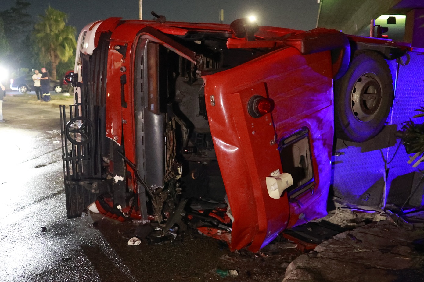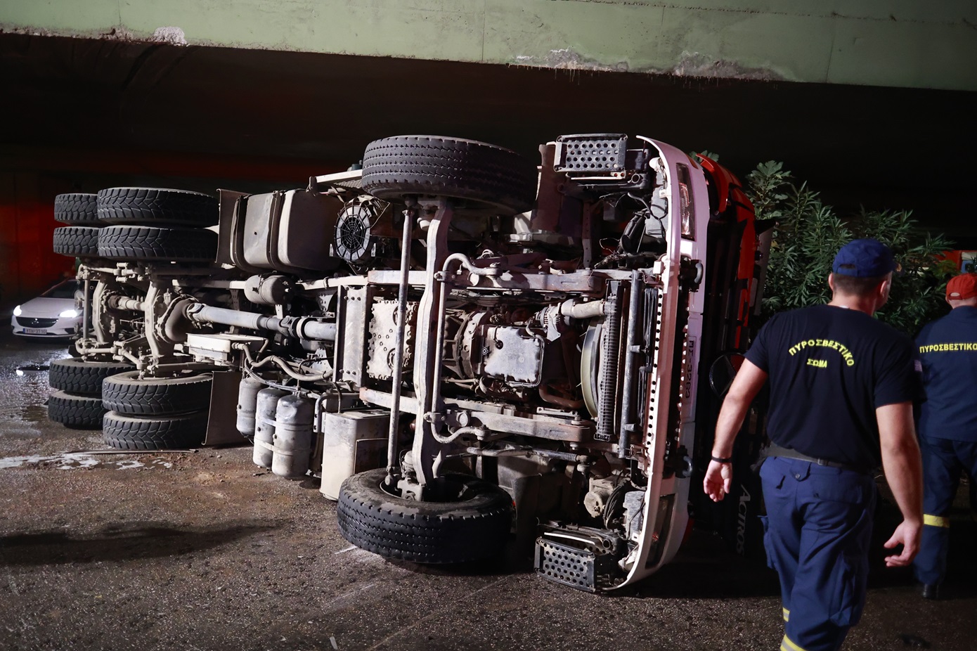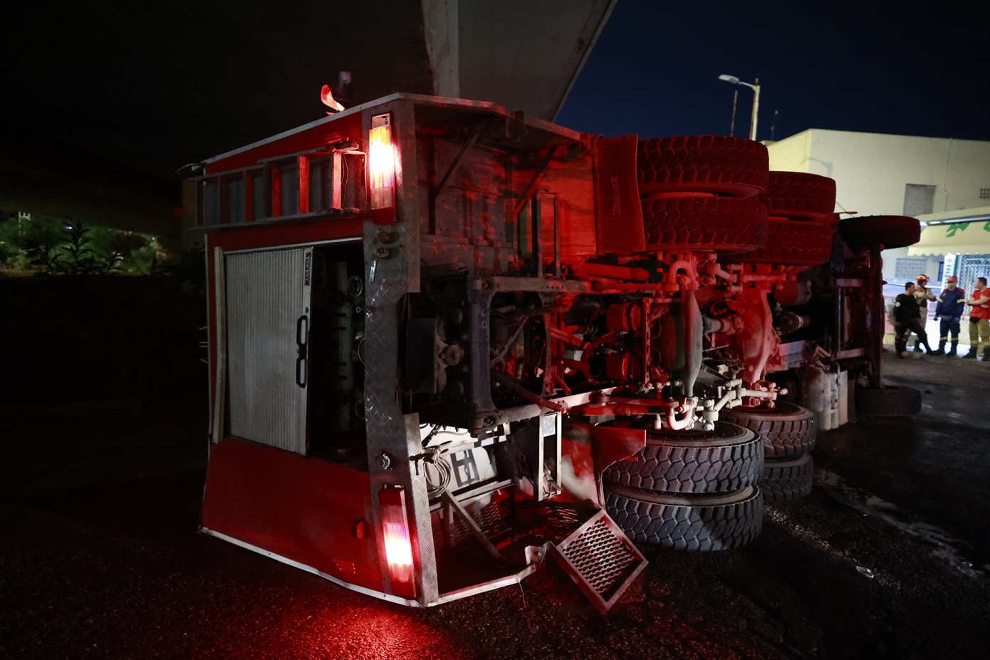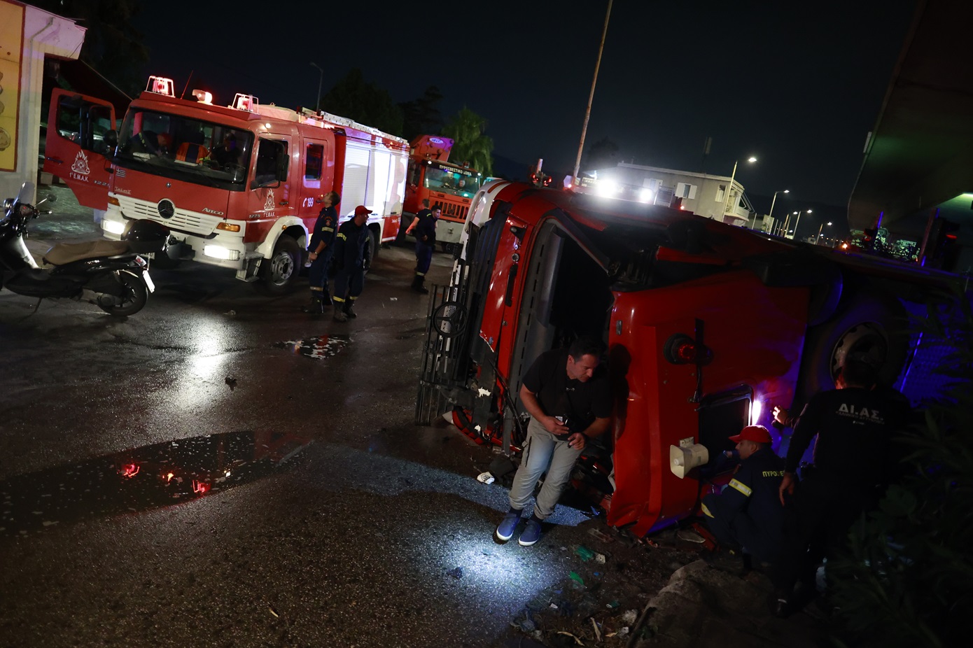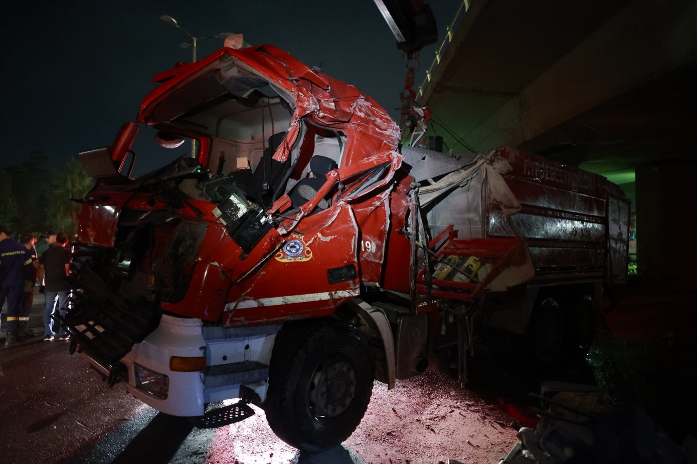 Από το ατύχημα τραυματίστηκαν ελαφρά δύο πυροσβέστες (ένας πενταετούς υποχρέωσης και ένας εποχικός, σύμφωνα με πληροφορίες).