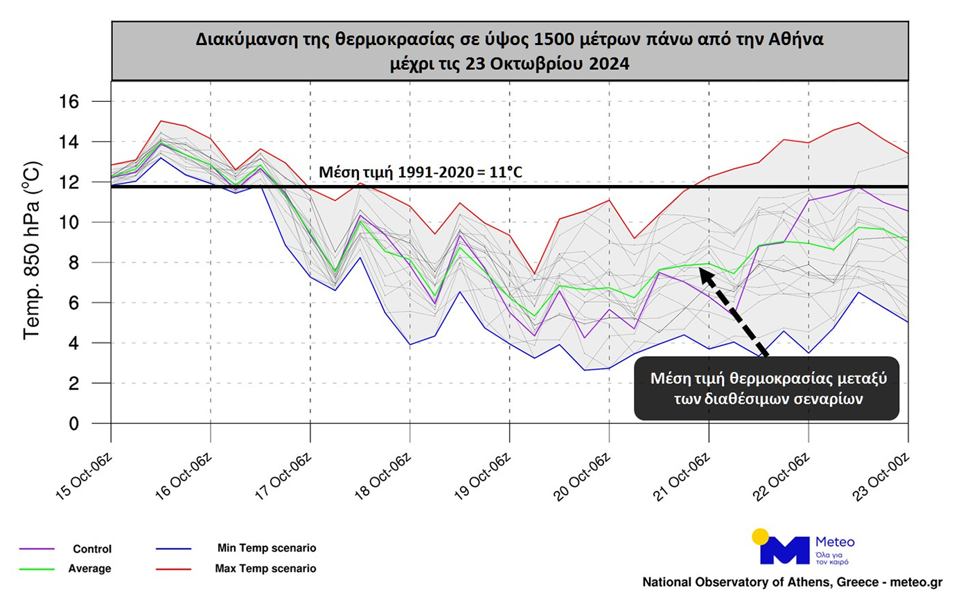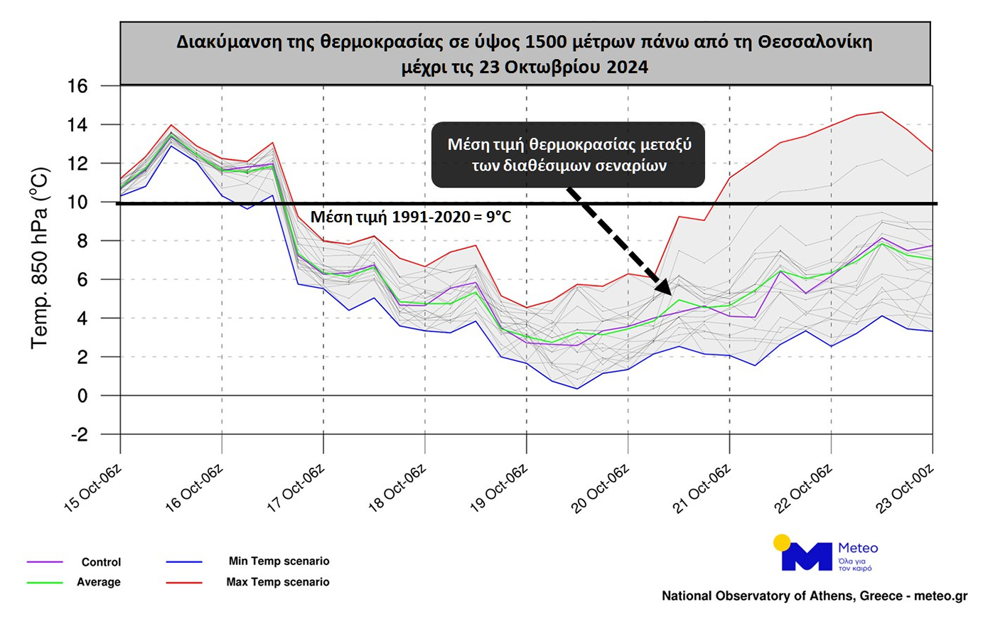 Στην εικόνες που ακολουθούν παρουσιάζεται ενδεικτικά το εύρος διακύμανσης της θερμοκρασίας έως τις 23/10 σε ύψος 1.500 περίπου μέτρων επάνω από την Αθήνα και τη Θεσσαλονίκη.