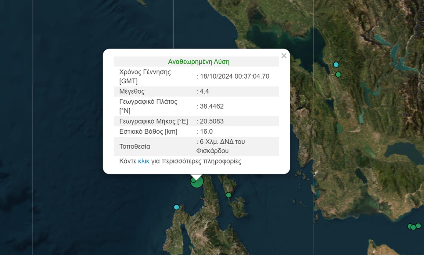 Σύμφωνα με το Γεωδυναμικό Ινστιτούτο του Εθνικού Αστεροσκοπείου Αθηνών η σεισμική δόνηση σημειώθηκε στις 03:37 ενώ το επίκεντρο του εντοπίζεται στον θαλάσσιο χώρο 6 χιλιόμετρα δυτικά-νοτιοδυτικά του Φισκάρδου, σε απόσταση 285 χλμ δυτικά-βορειοδυτικά των Αθηνών και το εστιακό του βάθος στα 16 χλμ.