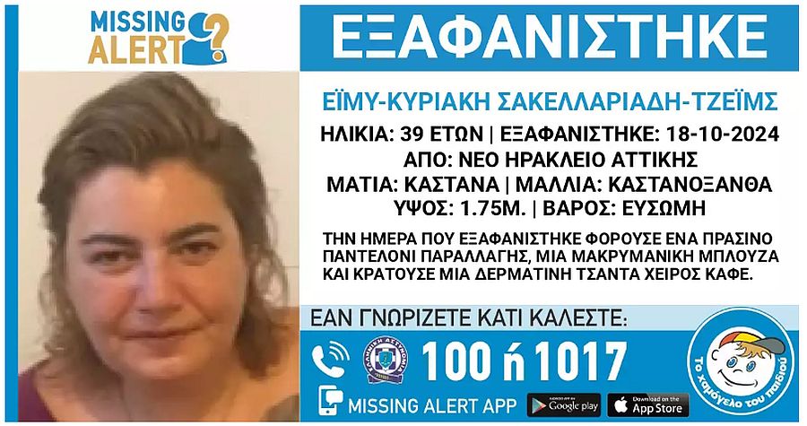 Το πρωί της 18ης Οκτωβρίου έγινε η εξαφάνιση από το Νέο Ηράκλειο Αττικής της 39χρονης Έιμυ – Κυριακής Σακελλαριάδη -Τζέιμς.