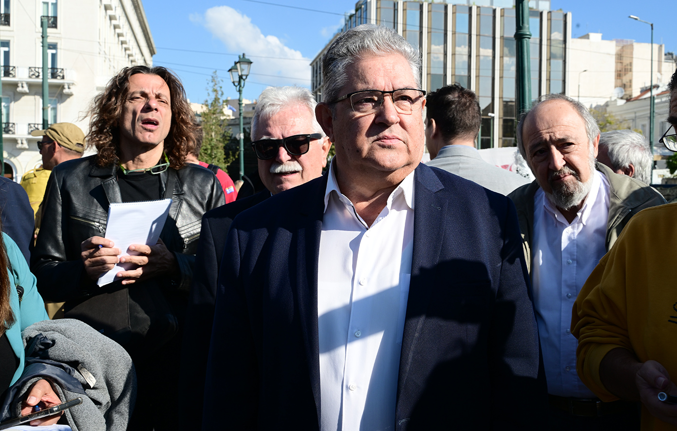 Στο συλλαλητήριο παραβρίσκεται και ο γενικός γραμματέας της ΚΕ του ΚΚΕ Δημήτρης Κουτσούμπας.