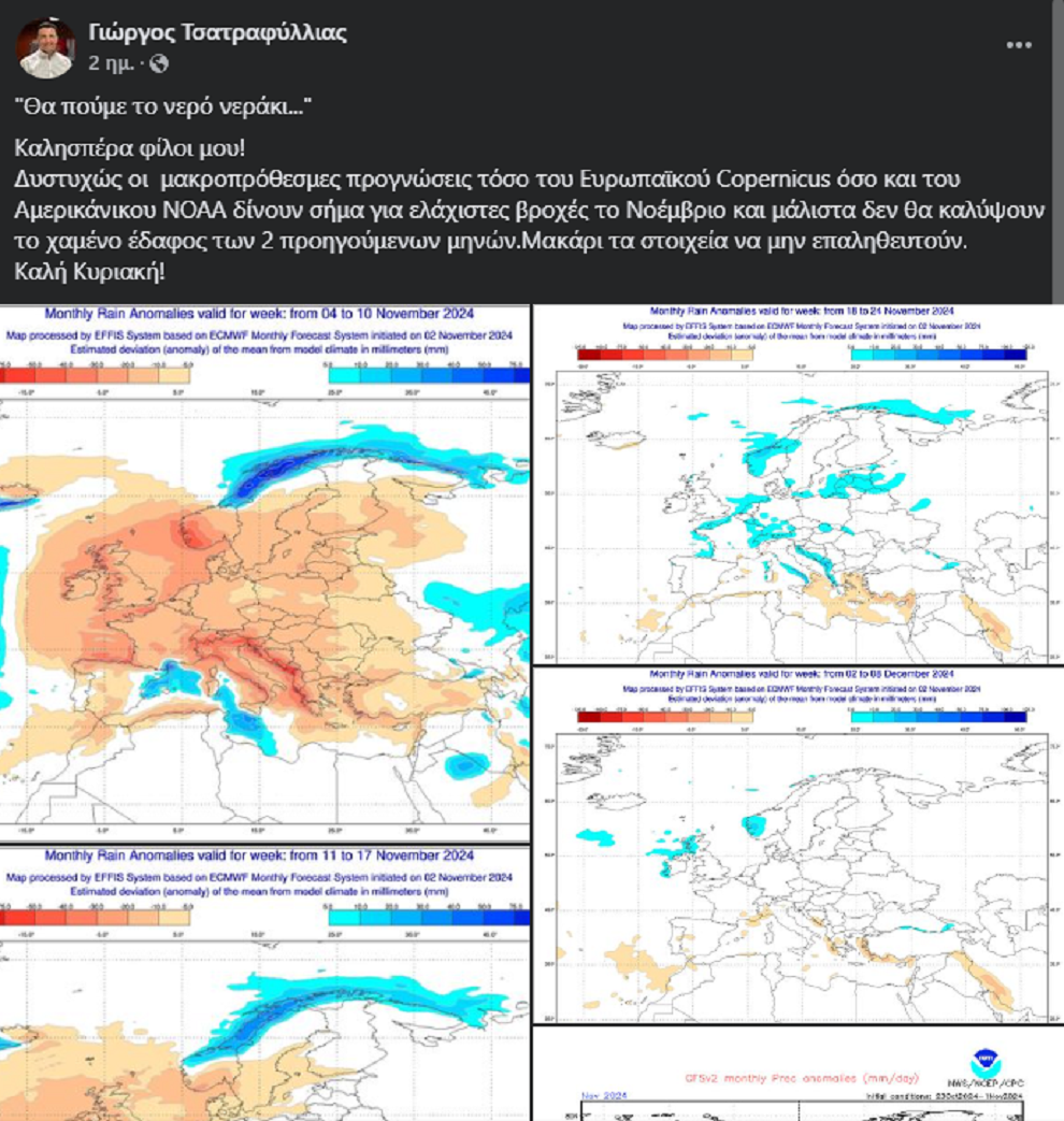 Επίσης, ο Γιώργος Τσατραφύλλιας σε ανάρτηση στα μέσα κοινωνικής δικτύωσης τόνισε ότι «θα πούμε το νερό, νεράκι…», καθώς αναμένεται να συνεχιστεί η ανομβρία, τη στιγμή που αρκετά μέρη στην Ελλάδα αντιμετωπίζουν πρόβλημα.