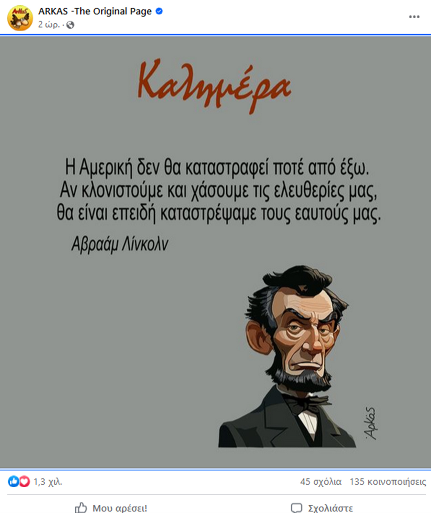Ο σκιτσογράφος δημοσίευσε εκτός από το μήνυμά του μία προσωπογραφία του Αβραάμ Λίνκολν.