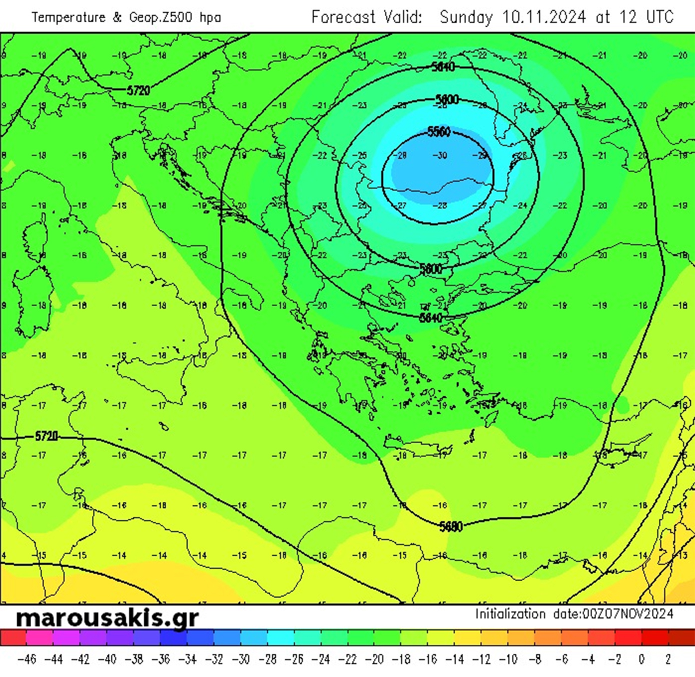 Μια διαταραχή λοιπόν σε υψηλότερα στρώματα της ατμόσφαιρας όπως απεικονίζεται στον πρώτο μας χάρτη με τις μπλε αποχρώσεις, θα αποτελέσει την αρχή της καιρικής αλλαγής αλλάζοντας τη ροή της κυκλοφορίας και ανοίγοντας την πόρτα μετά από πολλές ημέρες για να μας έρθουν οι κακοκαιρίες πλέον από τα δυτικά, με άλλα λόγια να ευθυγραμμιστεί η ατμοσφαιρική κυκλοφορία με την εποχή που διανύουμε.