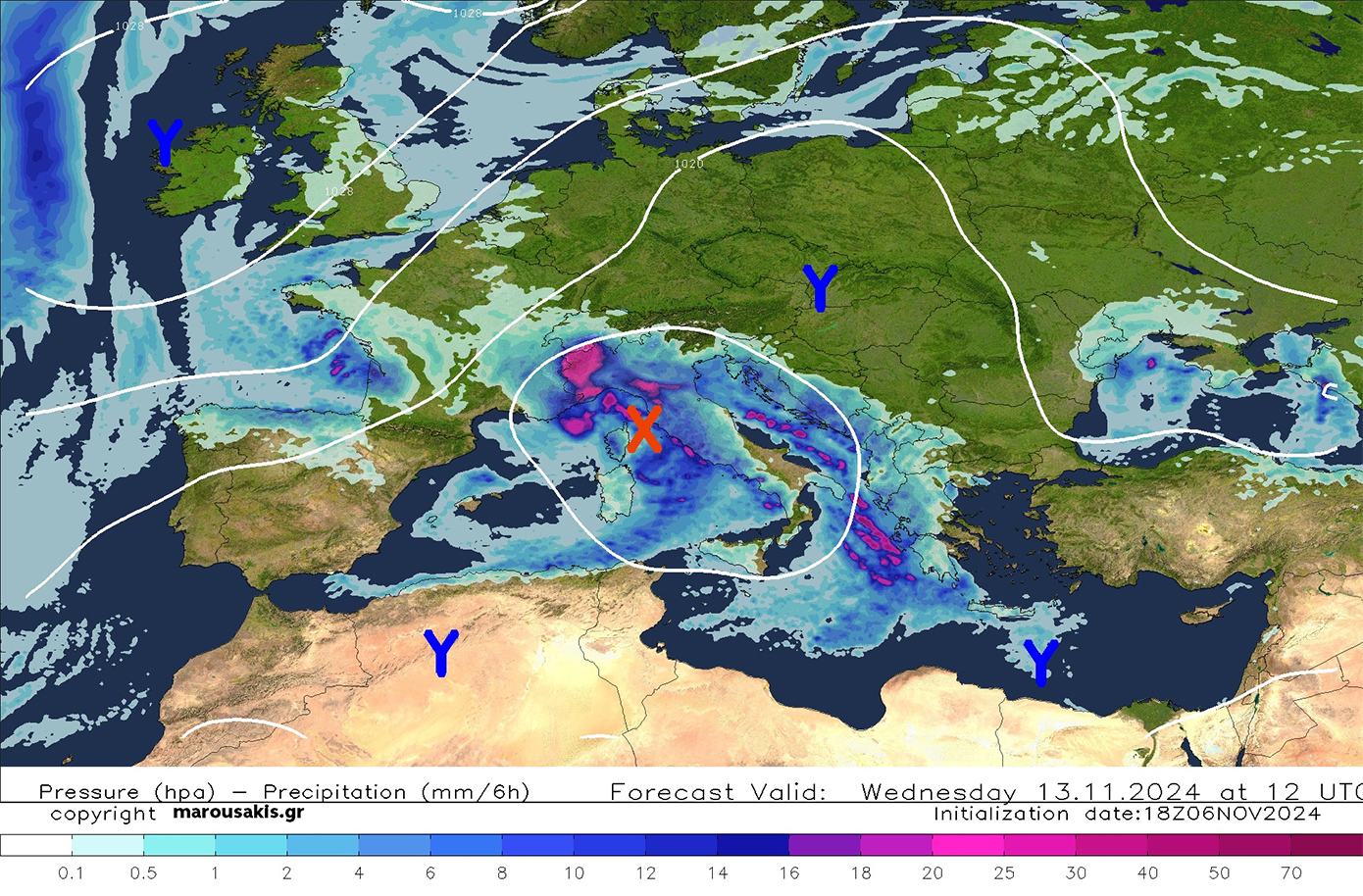 Στους επόμενους δύο χάρτες αποτυπώνεται η ατμοσφαιρική αλλαγή από τη μία όπου με το γράμμα «Χ» παρατηρούμε το πρώτο οργανωμένο βαρομετρικό χαμηλό από τα δυτικά μετά από καιρό, ενώ από την άλλη αποτυπώνονται οι βροχοπτώσεις που αναμένεται να σημειωθούν στις αρχές της νέας εβδομάδας.