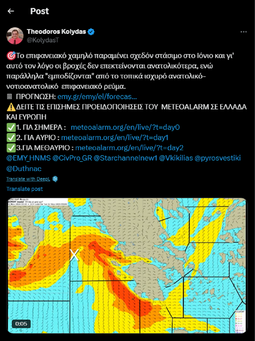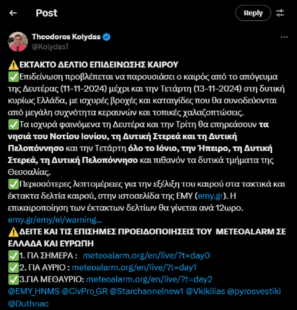 Ο διευθυντής της ΕΜΥ Θοδωρής Κολυδάς, σε ανάρτηση που έκανε στην πλατφόρμα Χ, δημοσίευσε χάρτες με τις περιοχές όπου αναμένονται έντονα φαινόμενα.