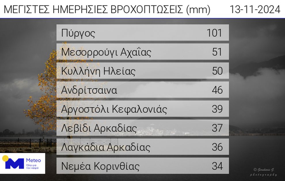 Σημειώνεται πως καταιγίδες επηρέασαν τον Πύργο Ηλείας από τις 00:00 έως τις 07:00 το πρωί της Τετάρτης 13/11, με το συνολικό ύψος βροχόπτωσης σύμφωνα με τον αυτόματο μετεωρολογικό σταθμό του meteo.gr/ΕΑΑ στην πόλη να ανέρχεται σε 101 χιλιοστά.