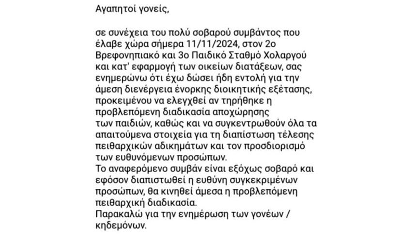 σε συνέχεια του πολύ σοβαρού συμβάντος που έλαβε χώρα 11/11/2024, στον 2ο Βρεφονηπιακό και 3ο Παιδικό Σταθμό Χολαργού και κατ’ εφαρμογή των οικείων διατάξεων, σας ενημερώνω ότι έχω δώσει ήδη εντολή για την άμεση διενέργεια ένορκης διοικητικής εξέτασης, προκειμένου να ελεγχθεί αν τηρήθηκε η προβλεπόμενη διαδικασία αποχώρησης των παιδιών, καθώς και να συγκεντρωθούν όλα τα απαιτούμενα στοιχεία για τη διαπίστωση τέλεσης πειθαρχικών αδικημάτων και τον προσδιορισμό των ευθυνόμενων προσώπων. Το αναφερόμενο συμβάν είναι εξόχως σοβαρό και εφόσον διαπιστωθεί η ευθύνη συγκεκριμένων προσώπων, θα κινηθεί άμεσα η προβλεπόμενη πειθαρχική διαδικασία».