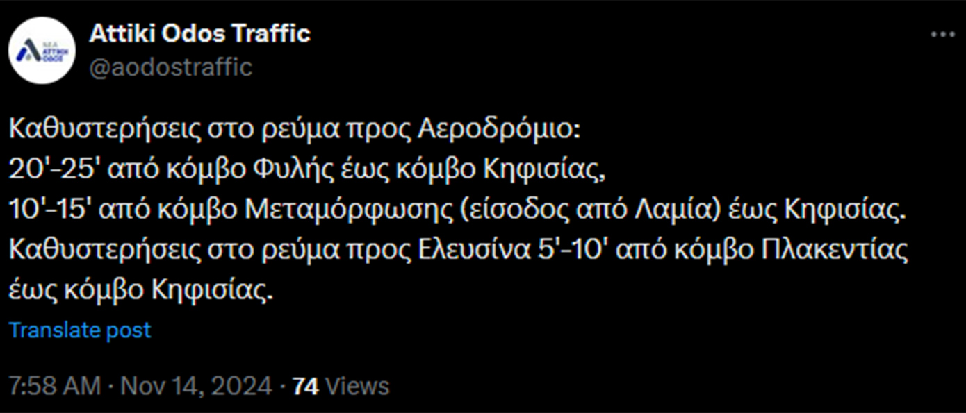 Ειδικότερα, εντοπίζονται καθυστερήσεις στο ρεύμα προς Αεροδρόμιο: 20′-25′ από κόμβο Φυλής έως κόμβο Κηφισίας, 10′-15′ από κόμβο Μεταμόρφωσης (είσοδος από Λαμία) έως Κηφισίας. Καθυστερήσεις στο ρεύμα προς Ελευσίνα 5′-10′ από κόμβο Πλακεντίας έως κόμβο Κηφισίας.
