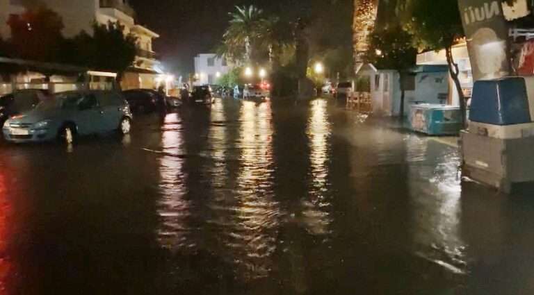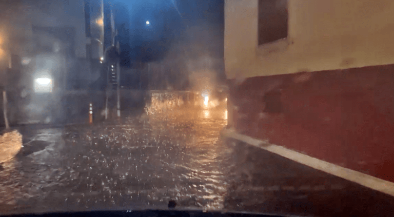 Εκεί, η στάθμη του νερού ανέβηκε σε επικίνδυνο βαθμό, ξεπερνώντας τα πεζοδρόμια και καθιστώντας τους δρόμους αδιάβατους.