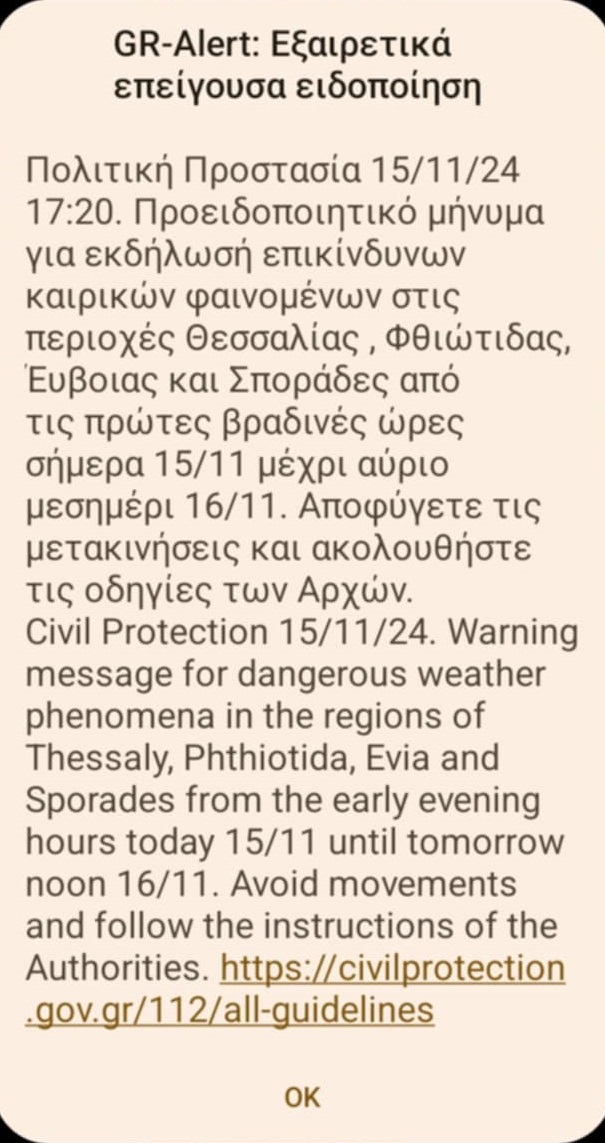 «Προειδοποιητικό μήνυμα για εκδήλωση επικίνδυνων καιρικών φαινομένων στην περιοχή σας, από τις πρώτες βραδινές ώρες σήμερα 15/11 έως αύριο μεσημέρι 16/11. Αποφύγετε τις μετακινήσεις σας και ακολουθείτε τις οδηγίες των Αρχών» αναφέρει το μήνυμα του 112.