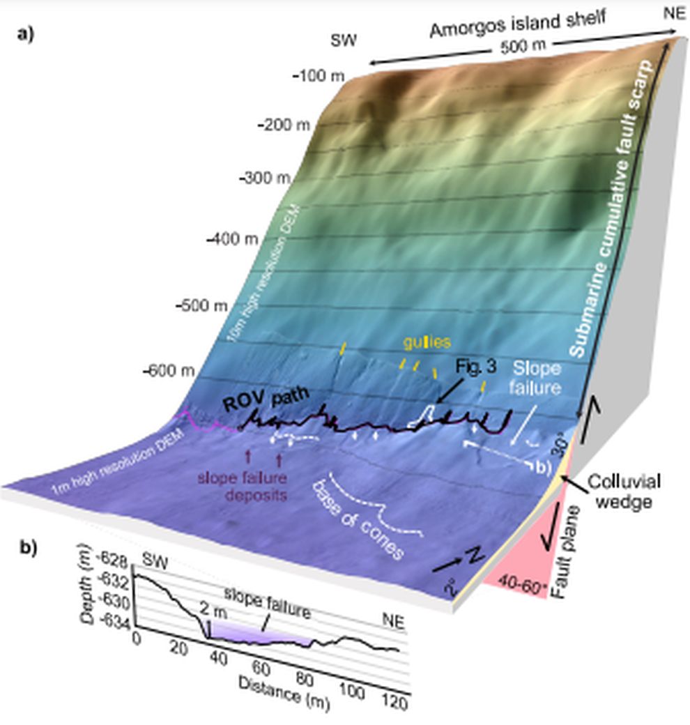 Το 2015, η διεθνής ωκεανογραφική αποστολή χαρτογράφησε τον θαλάσσιο πυθμένα μεταξύ της Σαντορίνης και της Αμοργού αποκαλύπτοντας τρία κύρια ρήγματα που βρίσκονται περίπου 700 μέτρα κάτω από την επιφάνεια της θάλασσας. Το 2022, η επόμενη αποστολή με το γαλλικό ωκεανογραφικό σκάφος Europe αναχώρησε από το Ηράκλειο της Κρήτης και κατευθύνθηκε προς τα ρήγματα αυτά. Συγκεκριμένα τμήματα των ρηγμάτων χαρτογραφήθηκαν σε πολύ υψηλή ανάλυση μικρότερη από ένα μέτρο, από ένα αυτόνομο υποβρύχιο όχημα βαθέων υδάτων (AUV IdefX), το οποίο μπόρεσε να καταδυθεί και να ταξιδέψει κοντά στον βυθό.