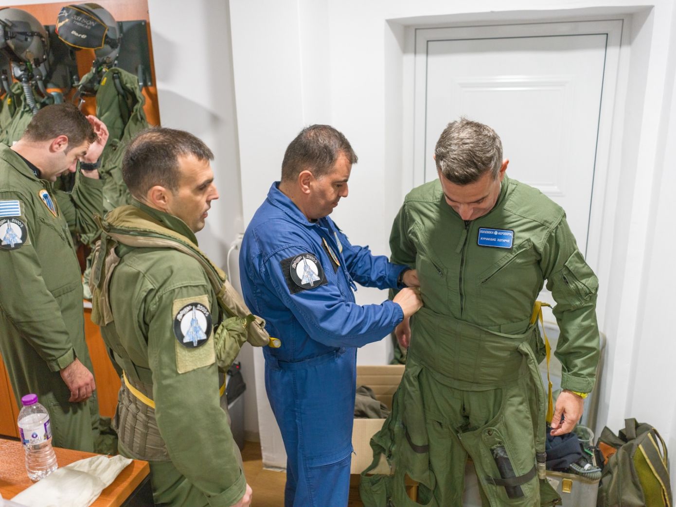 Η πτήση στην ουσία βέβαια είχε «ξεκινήσει» αρκετά νωρίτερα με τις τυπικές διαδικασίες που είναι απαραίτητες πριν να μπει κανείς σε κόκπιτ μαχητικού. Μερικά 24ωρα πριν, το κορμί και το μυαλό μου είχε βρεθεί για ένα ολόκληρο πρωινό στο Κέντρο Αεροπορικής Ιατρικής που βρίσκεται στο 251 Γενικό Νοσοκομείο Αεροπορίας. Από εκείνη την ημέρα, είναι η μια στιγμή που είχε μένει ανεξίτηλη στο νου μου και έπρεπε να ενσωματωθεί στο ρεπορτάζ. Ήταν η στιγμή στην οποία μια επικεφαλής οδοντίατρος της Πολεμικής Αεροπορίας, καθώς περνάω την έκτη στη σειρά ιατρική εξέταση και διαβάζει τον φάκελο μου με τα υπόλοιπα ιατρικά πορίσματα, ρωτά για την επερχόμενη πτήση και σηκώνοντας το κεφάλι της από την καρτέλα φωνάζει βροντερά: «να πετάξετε και για εμάς. Αυτό σας θα ήθελα να σας ζητήσω. Ναι, να πετάξετε για όλα τα στελέχη της ΠΑ». Μια φράση που είχε χαραχθεί στο μυαλό μου. Ναι, αφιερωμένο σε όλα τα στελέχη της ΠΑ όπως και σε όλους τους Έλληνες λοιπόν η μεταφορά του ρεπορτάζ. Στους απλούς πολίτες που γενιές μετά από γενιά, κοιτούν ειδήσεις των τελευταίων δεκαετιών στα ΜΜΕ και ακούνε για τις πτήσεις των αεροπόρων, ακούν τις ειδήσεις και σκέφτονται πως κάπου εκεί στον γαλάζιο ελληνικό ουρανό υπάρχει ένας/μια Έλληνας χειριστής μαχητικού αεροσκάφους που δεν αφήνει κανείς να αμφισβητήσει την εθνική κυριαρχία της πατρίδας του.