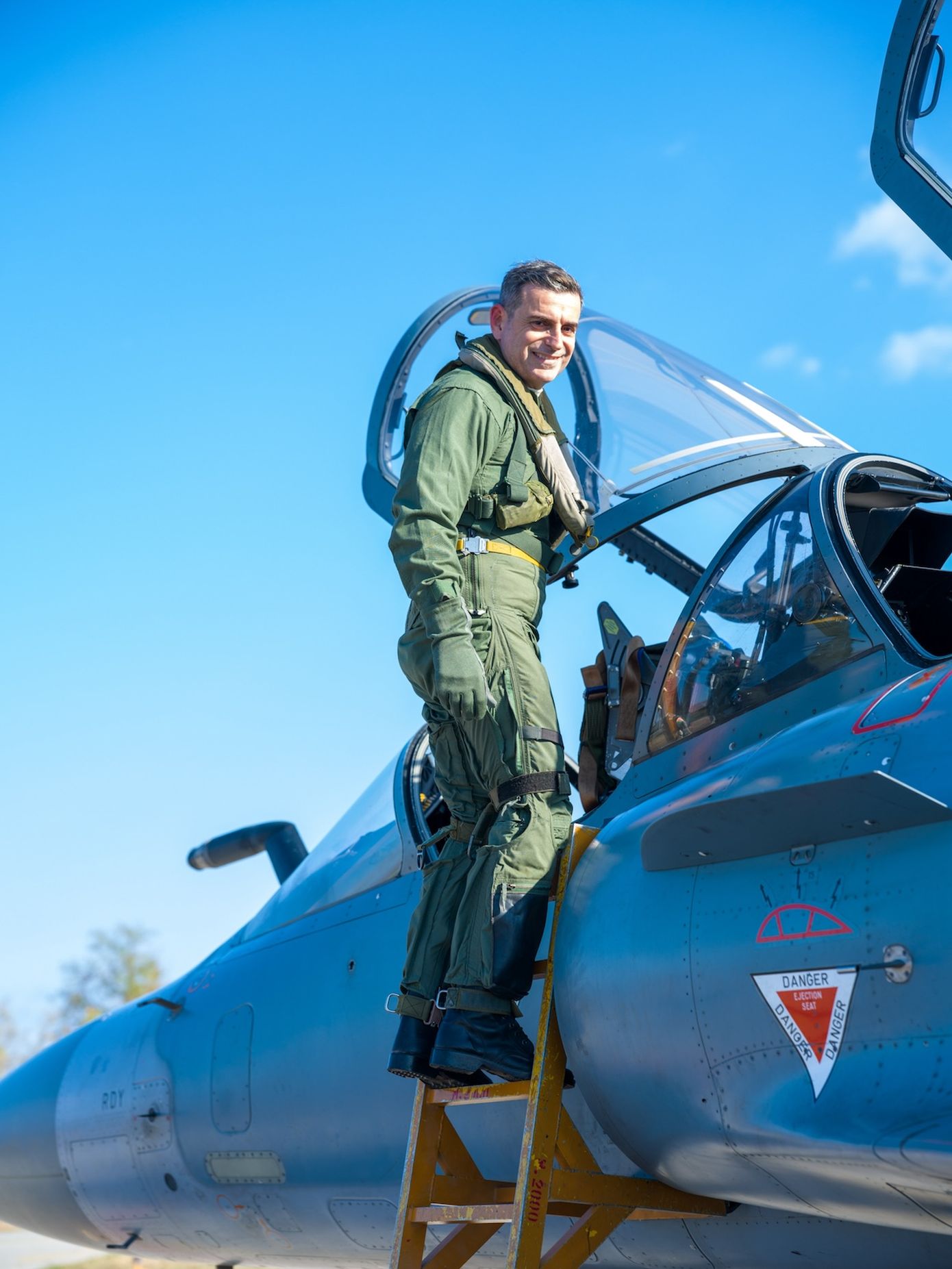 Ναι, εδώ δεν έχουμε να κάνουμε με μια πτήση και προσγείωση με τις ανέσεις των πολιτών. Είναι μια πολεμική μηχανή που προσγειώθηκε «αδρά» με επιτυχία. Και πάντα η ασφαλής προσγείωση είναι που μετρά πάνω από όλα για κάθε ιπτάμενο μέσο. Λίγο μετά, ο Ιπτάμενος της ΠΑ μου δίνει εντολή να ολοκληρώσω μια διαδικασία που σχετίζεται με την χρήση του εκτινασσόμενου καθίσματος ώστε να γυρίσει με ασφάλεια στο καταφύγιο του το γαλλικό μαχητικό: η άφιξη στη βάση είναι γεγονός. Μια σύνθετη δημοσιογραφική αποστολή, εξετελέσθη. Είμαστε από υπεράνθρωποι στα ουράνια, ξανά γήινα πλάσματα και οι δύο.