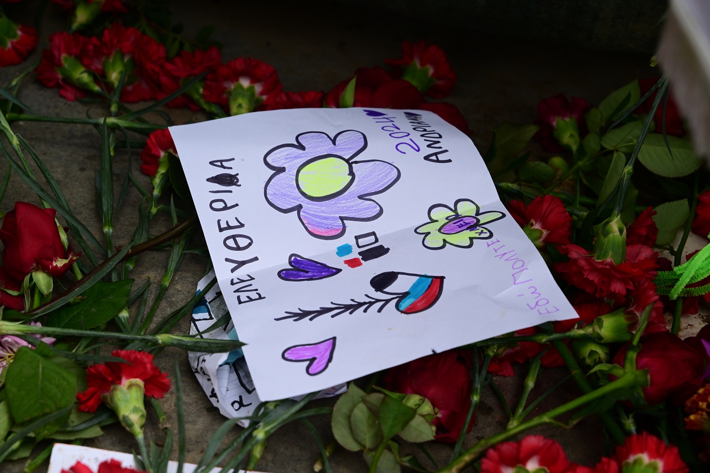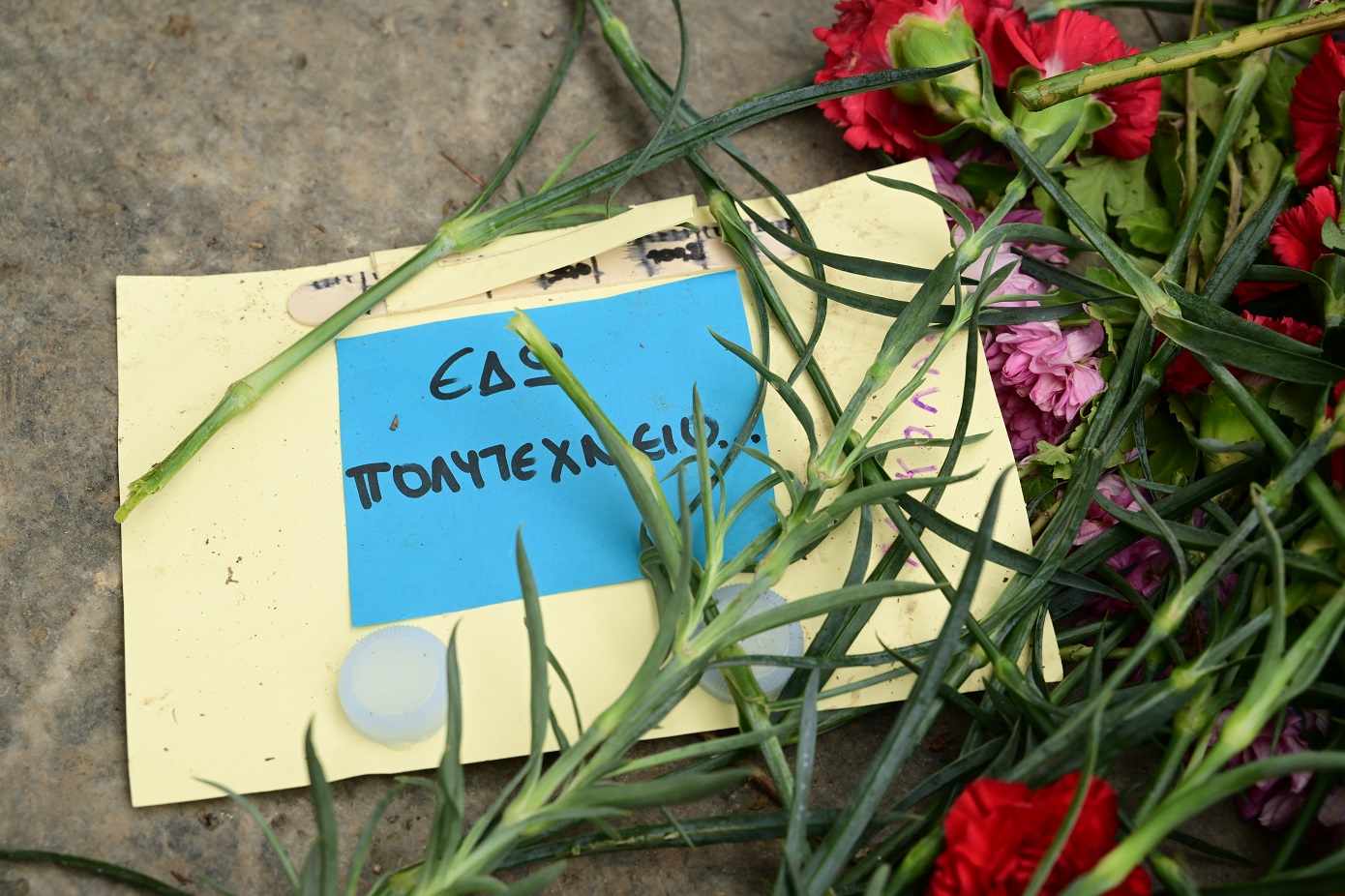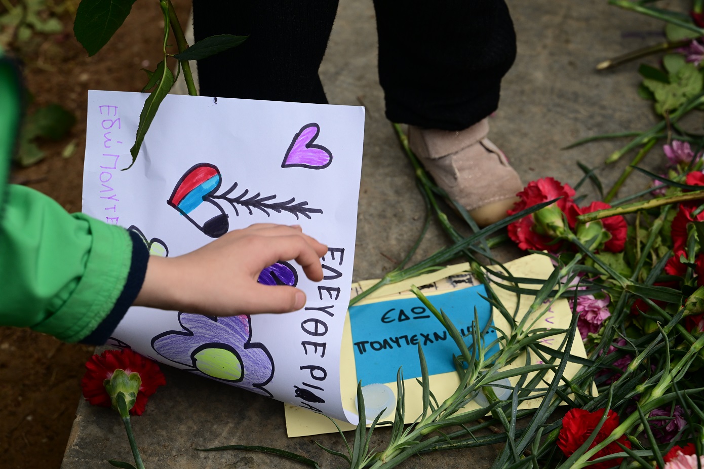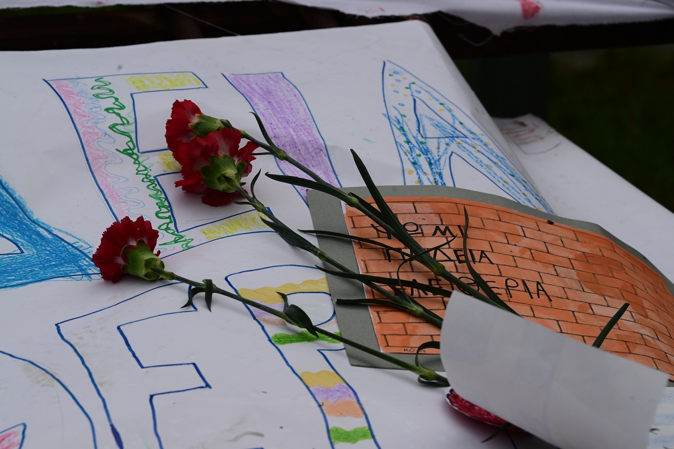 Πρωταγωνιστές και φέτος τα μικρά παιδιά που άφησαν μία ζωγραφιά και ένα κόκκινο γαρύφαλλο στο μνημείο που βρίσκεται στον προαύλιο χώρο του Πολυτεχνείου.