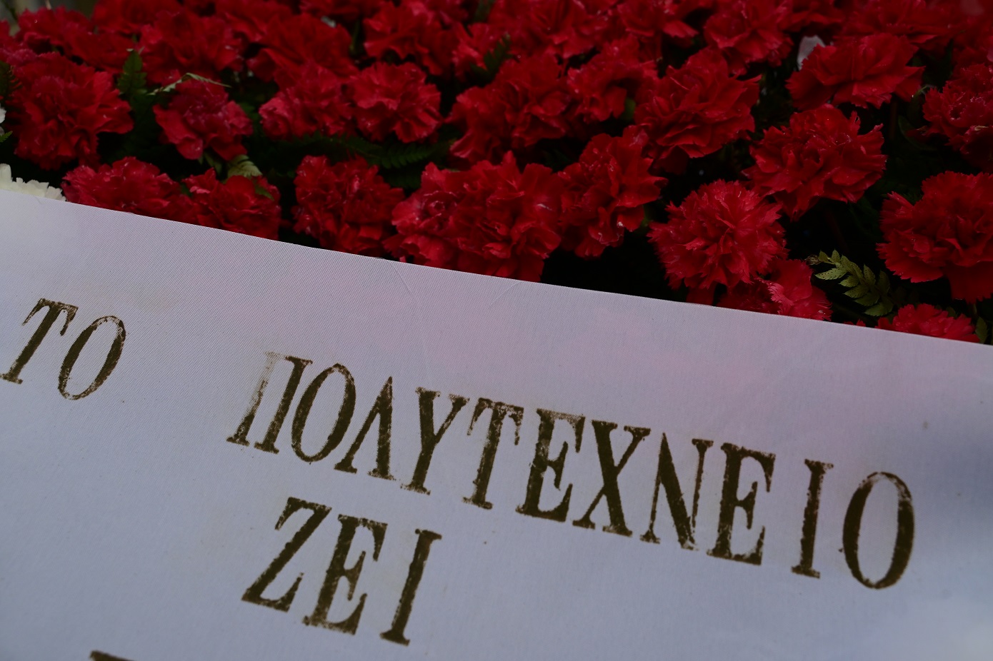 Πλήθος κόσμου, μικροί και μεγάλοι πέρασαν τις πύλες του Πολυτεχνείου από τις 9 το πρωί για να καταθέσουν στεφάνια, να αφήσουν ένα λουλούδι.