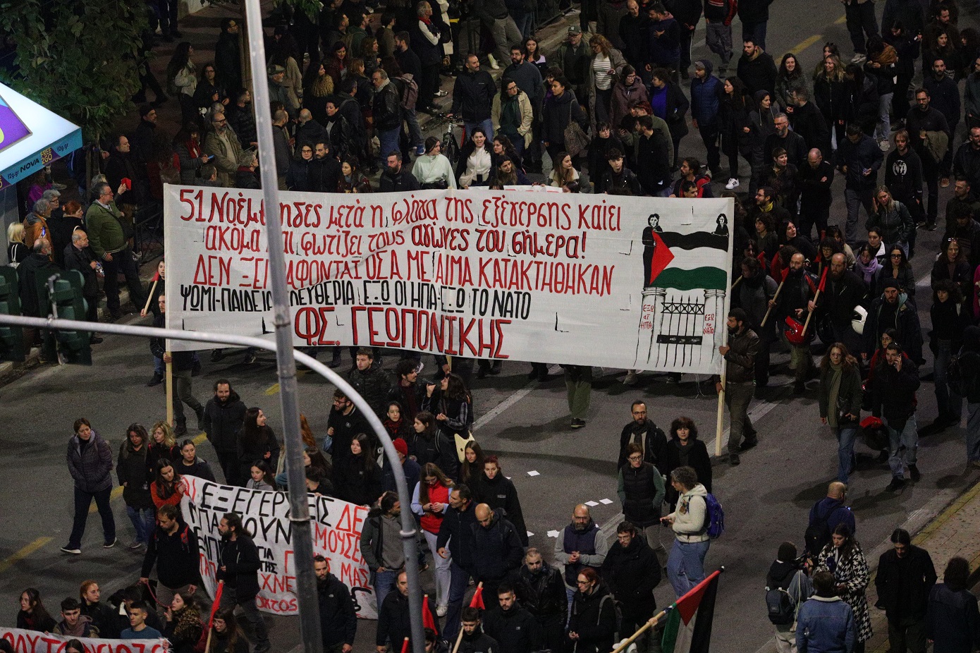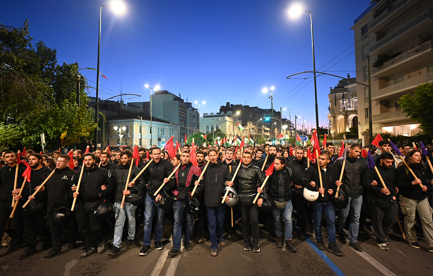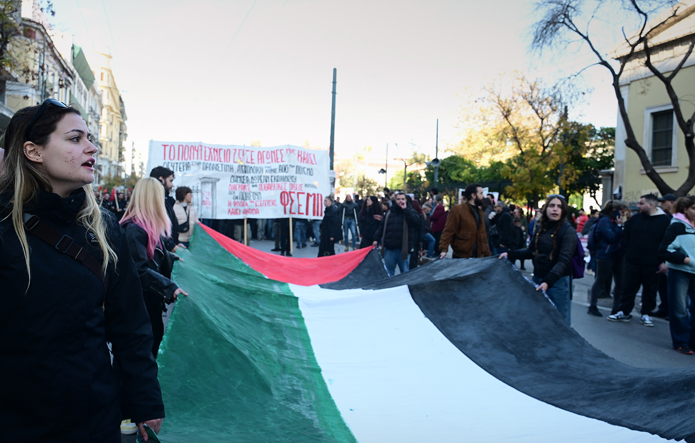 Νωρίτερα, όταν έκλεισαν οι πύλες του Πολυτεχνείου, φοιτητικοί σύλλογοι κρατώντας μια μεγάλη παλαιστινιακή σημαία πραγματοποίησαν προσυγκέντρωση και με πορεία κατευθύνθηκαν στο άγαλμα του Κολοκοτρώνη περιμένοντας να ξεκινήσει ο κύριος όγκος της διαδήλωσης.