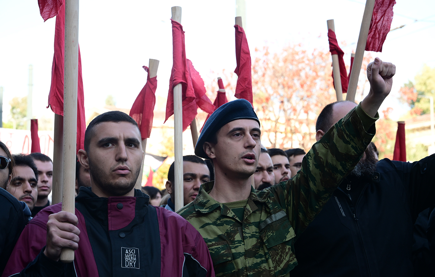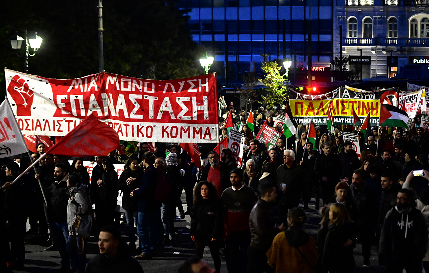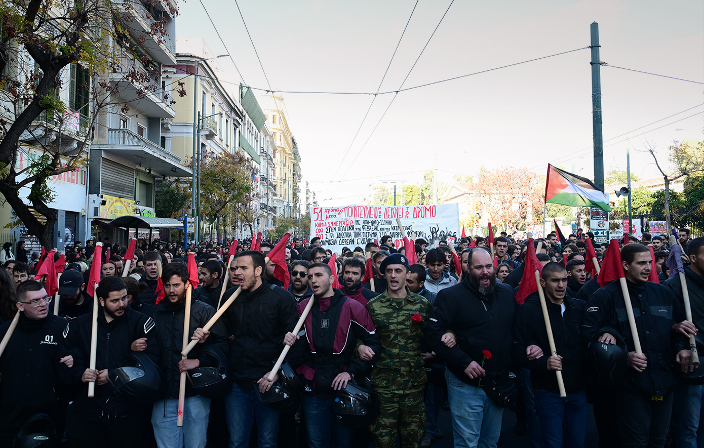 «Το Πολυτεχνείο ζει, έξω οι Αμερικανοί», «Ούτε γη, ούτε νερό, στους φονιάδες των λαών», «Φονιάδες των λαών Αμερικάνοι», «Ένας αιώνας αγώνας και θυσία, το ΚΚΕ στην πρωτοπορία» ήταν τα συνθήματα που κυριάρχησαν στη μεγάλη πορεία των Οργανώσεων του ΚΚΕ και της ΚΝΕ, η οποία ξεκίνησε αργότερα προς την αμερικάνικη και την ισραηλινή πρεσβεία.