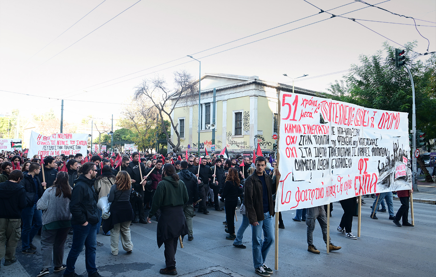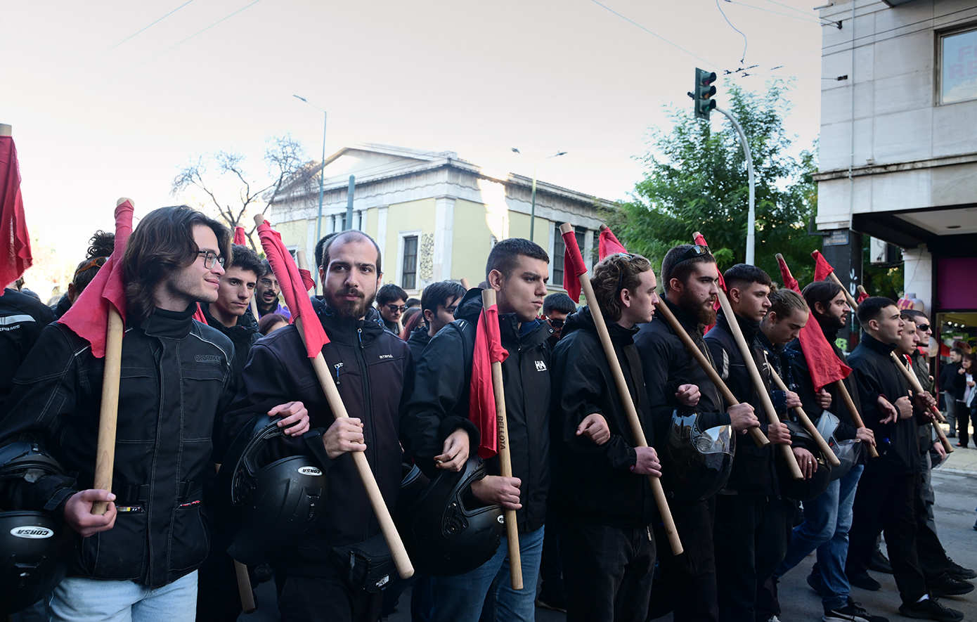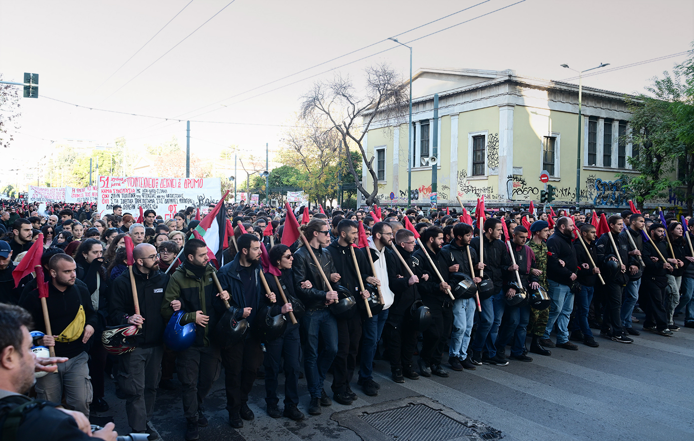 Φοιτητικοί σύλλογοι με κεντρικά συνθήματα «Το Πολυτεχνείο ζει σε αγώνες μας καλεί» και «Λευτεριά στην Παλαιστίνη», φορείς, ο ΣΥΡΙΖΑ-ΠΣ, το ΠΑΣΟΚ-Κίνημα Αλλαγής, η Πλεύση Ελευθερίας, η Νέα Αριστερά, το ΜέΡΑ25, κόμματα κι οργανώσεις της εξωκοινοβουλευτικής Αριστεράς, εργατικά σωματεία και συλλογικότητες του αντιεξουσιαστικού χώρου, συγκεντρώθηκαν από νωρίς το απόγευμα στην πλατεία Κλαυθμώνος και στο άγαλμα του Κολοκοτρώνη.