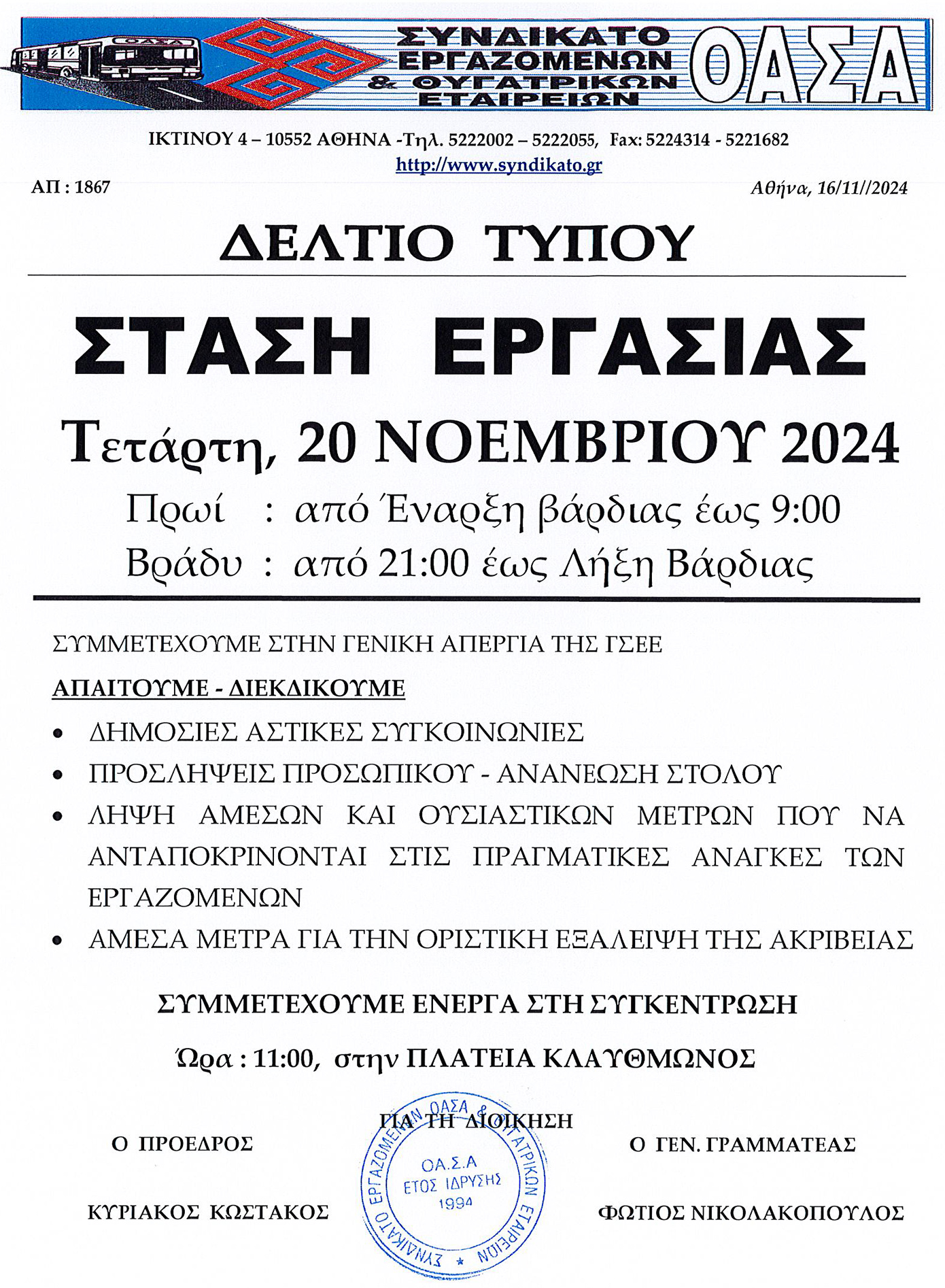 την πραγματοποίηση 24ωρης Γενικής Απεργίας για την Τετάρτη 20 Νοεμβρίου 2024