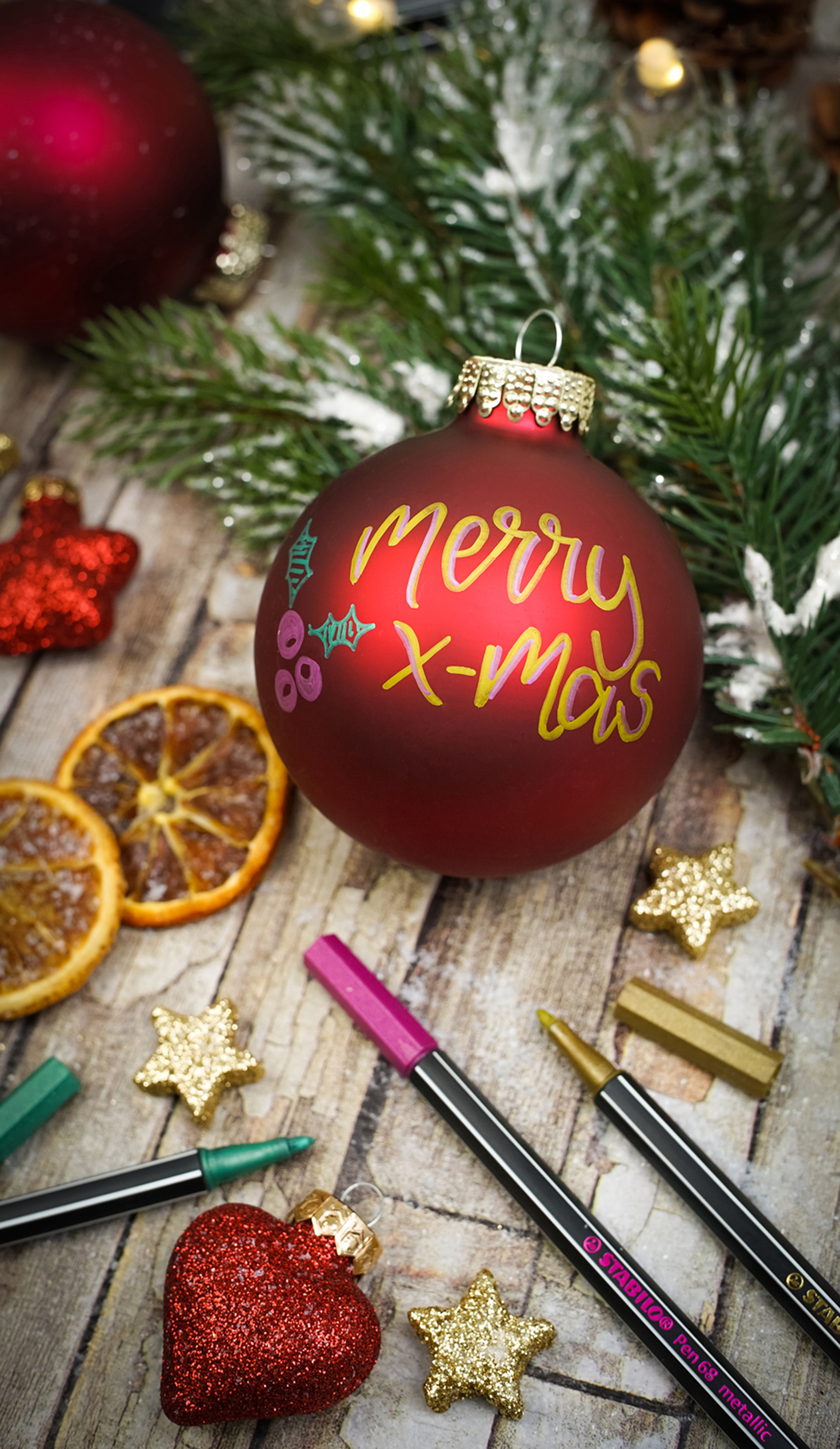 Αν αγαπάς τη διακόσμηση, δοκίμασε να φτιάξεις χειροποίητες μπάλες για το δέντρο με τη βοήθεια των προϊόντων STABILO. Χρησιμοποίησε τα STABILO Pen 68 και STABILO Pen 68 metallic για να ζωγραφίσεις και να προσθέσεις χρώμα σε μαύρες μπάλες. Εντυπωσίασε τους φίλους και την οικογένειά σου με πρωτότυπες δημιουργίες και φωτεινά χρώματα που θα προσθέσουν μια γιορτινή ατμόσφαιρα.