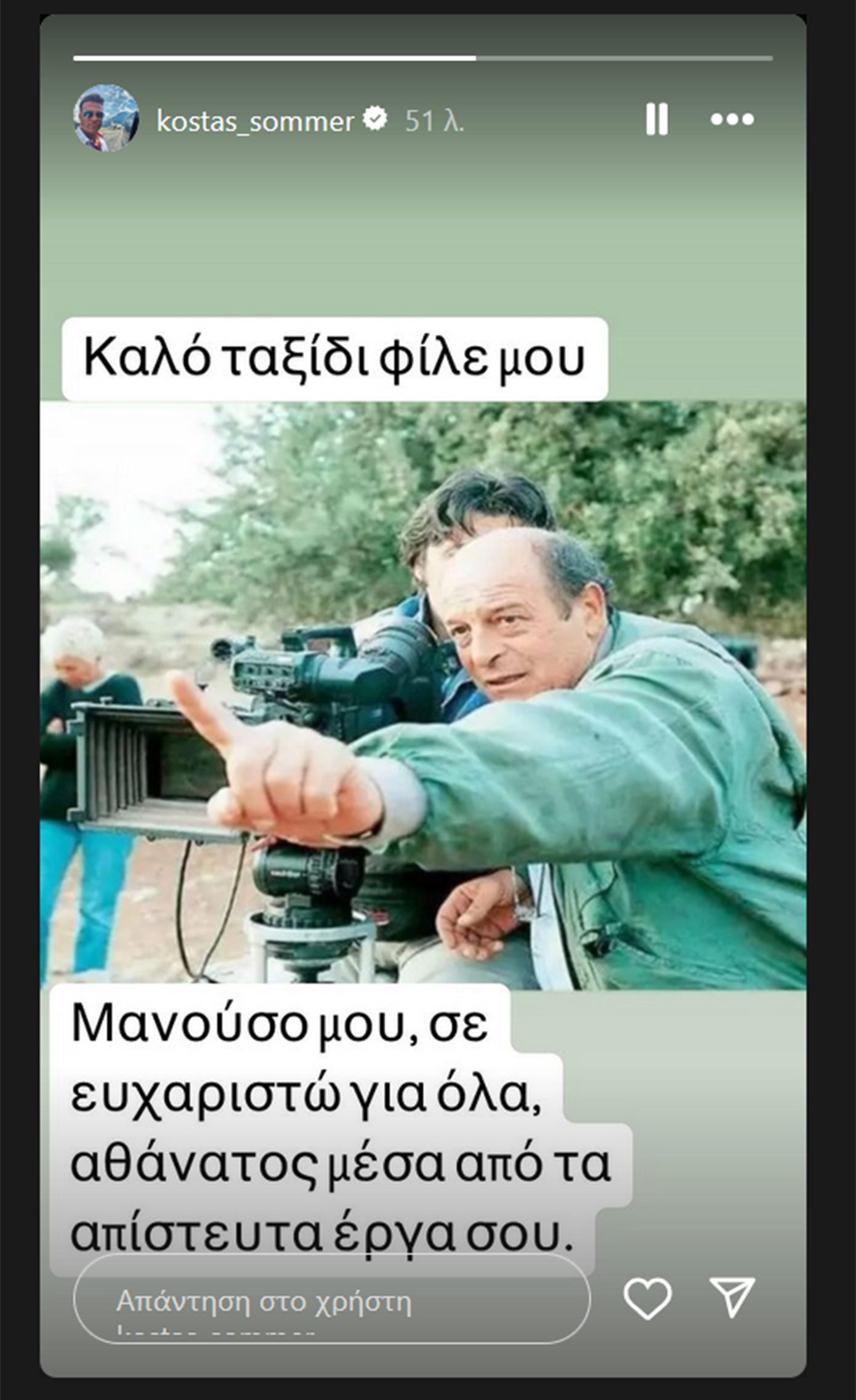 «Σε ευχαριστώ για όλα… σου χρωστάω πολλά! Σκηνοθέτησε με τα ωραία σου τα κοντινά τους αγγέλους εκεί πάνω και χτίσε τις καριέρες τους, όπως έκανες σε αρκετούς από εμάς εδώ κάτω», έγραψε σε ανάρτησή του ο Γιάννης Τσιμιτσέλης.