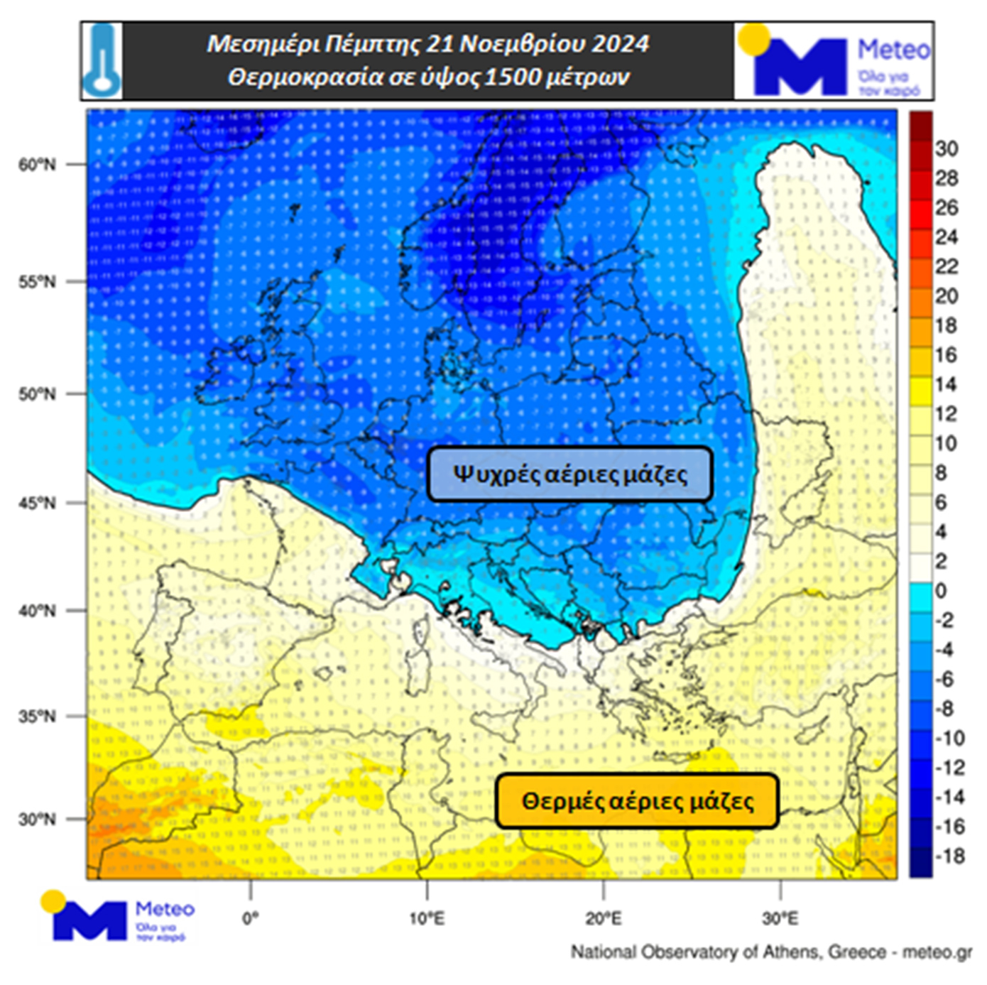 Σημαντική πτώση θα παρουσιάσει η θερμοκρασία στην Κεντρική και Ανατολική Ευρώπη από την Τετάρτη 20/11 λόγω της μεταφοράς ψυχρών αερίων μαζών και σύμφωνα με τα τελευταία προγνωστικά δεδομένα του meteo.gr / Εθνικού Αστεροσκοπείου Αθηνών. Αναμένονται θερμοκρασίες κοντά στο μηδέν και χιονοπτώσεις ακόμη και σε περιοχές χαμηλού υψομέτρου.