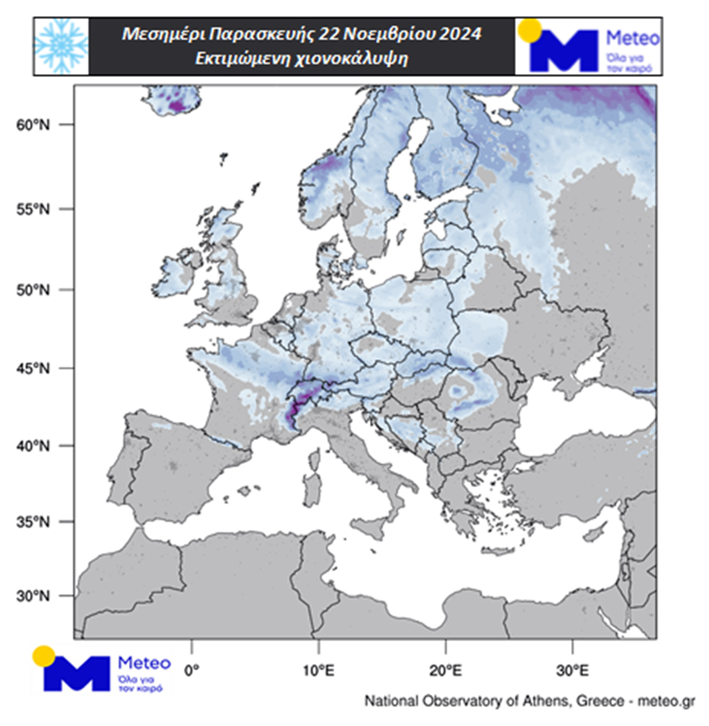 Στον Χάρτη 1 παρουσιάζεται η θερμοκρασία που αναμένεται το μεσημέρι της Πέμπτης 21/11 σε ύψος 1500 μέτρων από τη μέση στάθμη της θάλασσας. Με γαλάζιες/μπλε αποχρώσεις φαίνονται οι ψυχρότερες αέριες μάζες ενώ με κίτρινες/κόκκινες οι θερμότερες. Στον Χάρτη 2 παρουσιάζεται η εκτιμώμενη χιονοκάλυψη μέχρι το μεσημέρι της Παρασκευής 22/11.