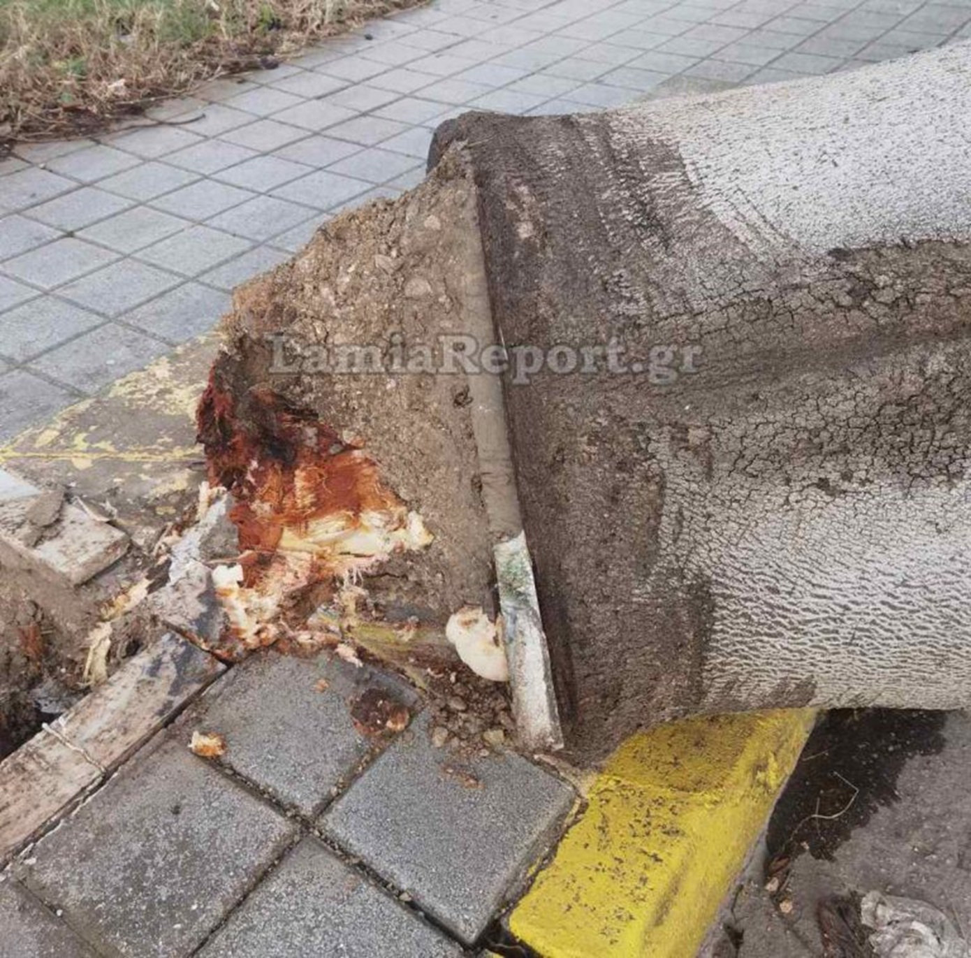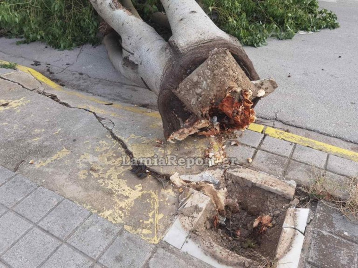 Το δέντρο κόπηκε από τη ρίζα επί της οδού Ταϋγέτου και βρέθηκε στο οδόστρωμα λίγα λεπτά πριν τις 15:30’ εξαιτίας του δυνατού αέρα, όπως αναφέρει το τοπικό μέσο lamiareport.gr.