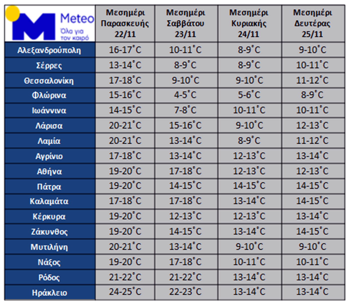 Στον παρακάτω πίνακα παρουσιάζονται οι θερμοκρασίες που αναμένονται το μεσημέρι της Παρασκευής 22/11, του Σαββάτου 23/11, της Κυριακής 24/11 και της Δευτέρας 25/11 σε επιλεγμένες πόλεις.