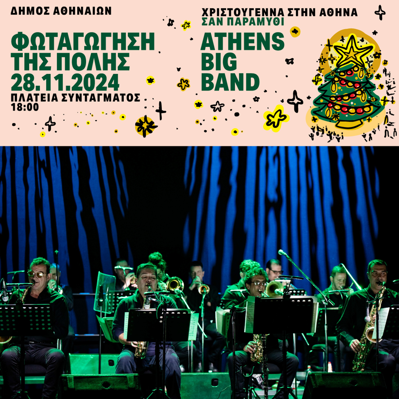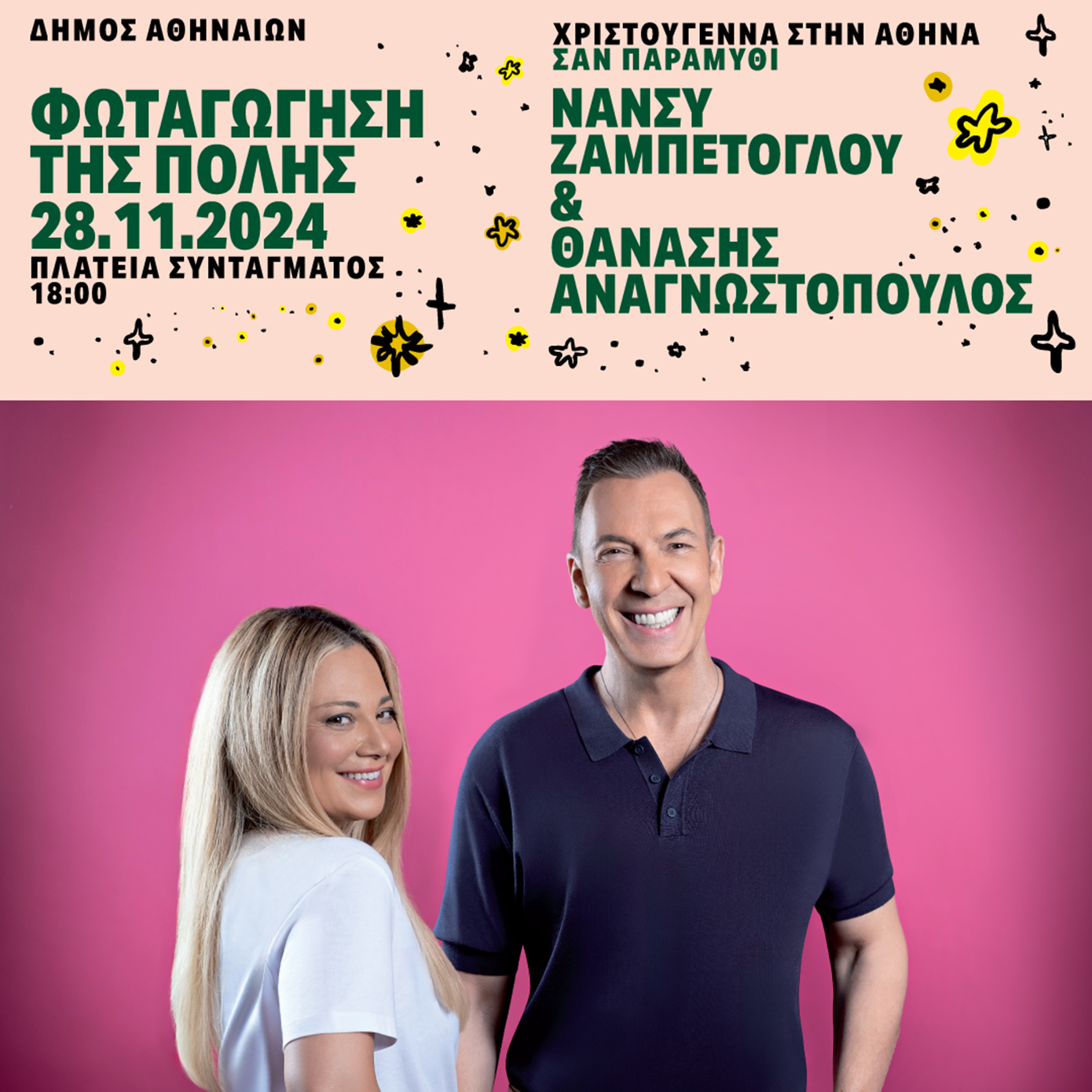 Η ανακοίνωση του Δήμου Αθηναίων αναφέρει ακόμη τα εξής: H «αφήγηση» του αθηναϊκού παραμυθιού των Χριστουγέννων αρχίζει από τη λαμπερή σκηνή της Πλατείας Συντάγματος, με ένα ιδιαίτερα αγαπητό και επιτυχημένο δίδυμο, τη Νάνσυ Ζαμπέτογλου και τον Θανάση Αναγνωστόπουλο. Οι παρουσιαστές της βραδιάς μαζί με τον δήμαρχο Αθηναίων, Χάρη Δούκα, θα δώσουν το σύνθημα για να φωταγωγηθεί το έλατο, αποκαλύπτοντας τον παραμυθένιο διάκοσμο ολόκληρης της Πλατείας Συντάγματος, ώστε η χριστουγεννιάτικη μαγεία να απλωθεί –περισσότερο από κάθε άλλη χρονιά– σε κάθε γωνιά της πόλης. Από τη βραδιά δεν γίνεται να λείπει η μουσική. Η ονειρική φωνή της Νεφέλης Φασούλη συναντά την Athens Big Band και μαζί παρουσιάζουν διασκευές αγαπημένων χριστουγεννιάτικων τραγουδιών.