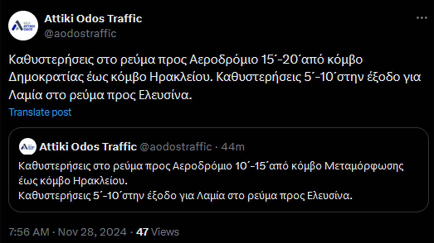 Σύμφωνα με την Αττική Οδό υπάρχουν καθυστερήσεις στο ρεύμα προς Αεροδρόμιο 15΄-20΄από κόμβο της Δημοκρατίας έως κόμβο του Ηρακλείου και καθυστερήσεις 5΄-10΄στην έξοδο για Λαμία στο ρεύμα προς Ελευσίνα.