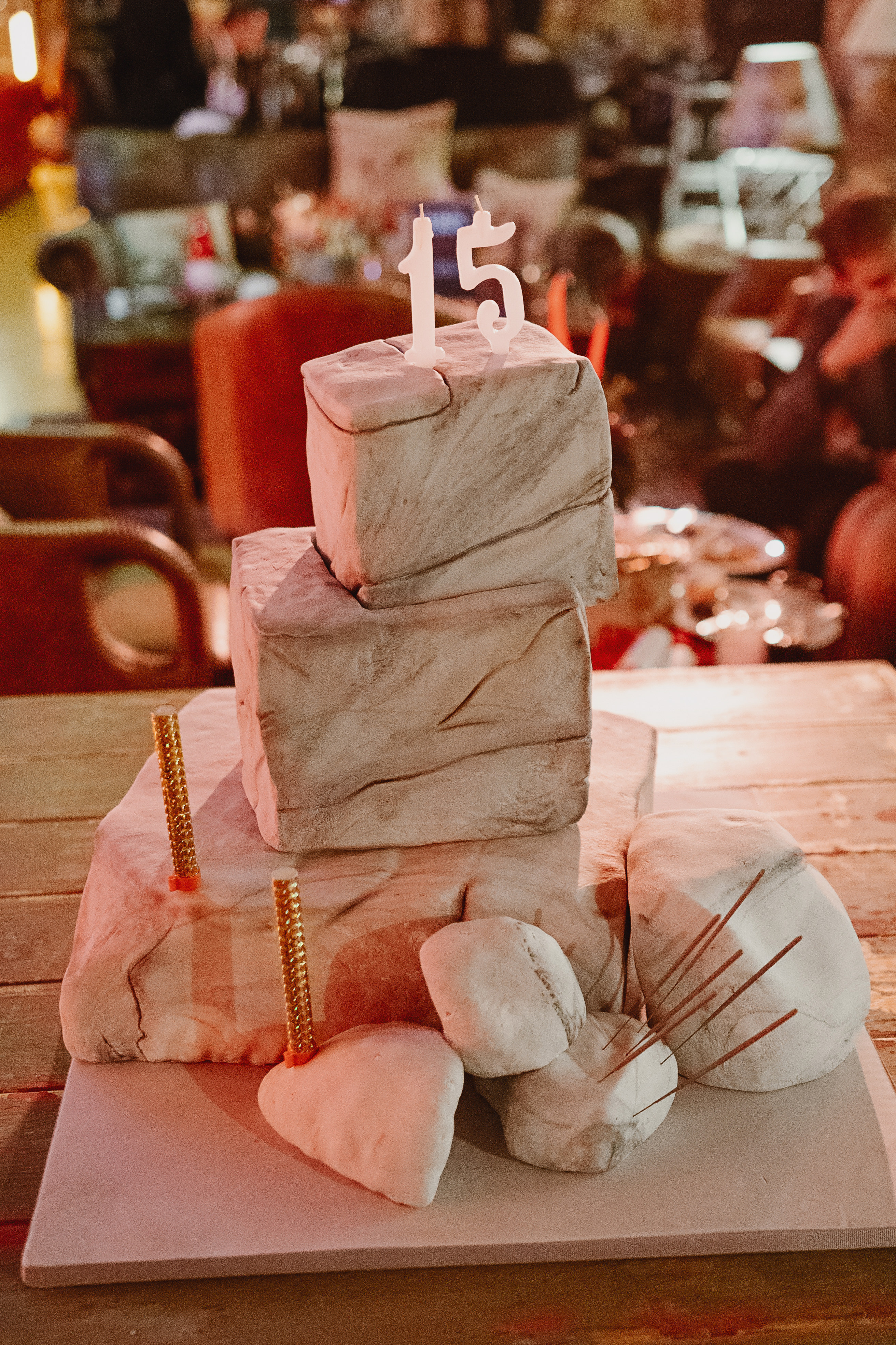 Η εντυπωσιακή γενέθλια τούρτα σε σχέδιο εμπνευσμένο από την ονομασία του Κτήματος (Λάας – λίθος) με τον αριθμό 15 έκανε την εμφάνισή της, δευτερόλεπτα προτού το συγκρότημα 48 ΩΡΕΣ ξεκινήσει να διασκεδάζει τους καλεσμένους.