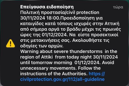 Στο μήνυμα, η Πολιτική Προστασία προειδοποιεί για ισχυρές κατά τόπους καταιγίδες, ιδιαίτερα αργά το βράδυ μέχρι τις πρώτες πρωινές ώρες της Κυριακής, ενώ εφιστά την προσοχή των πολιτών κατά τις μετακινήσεις τους.
