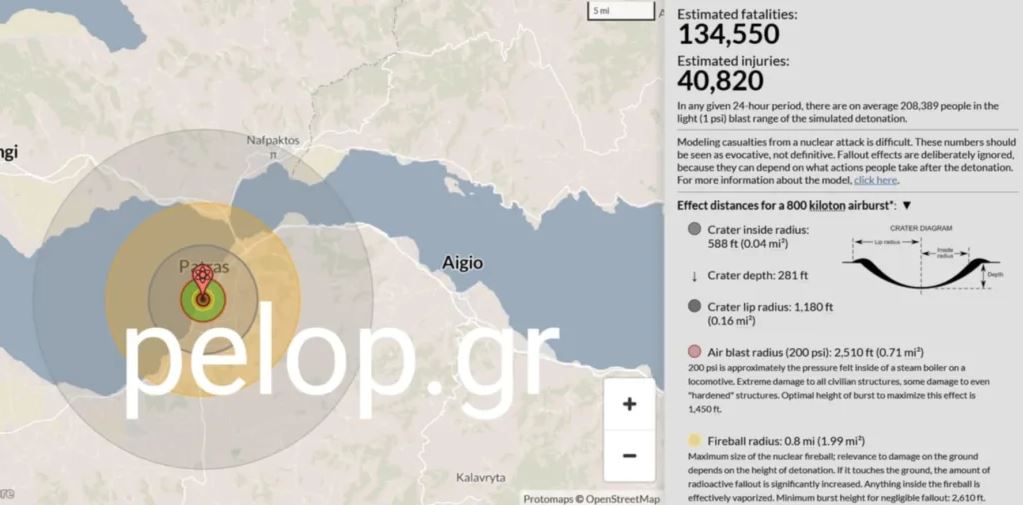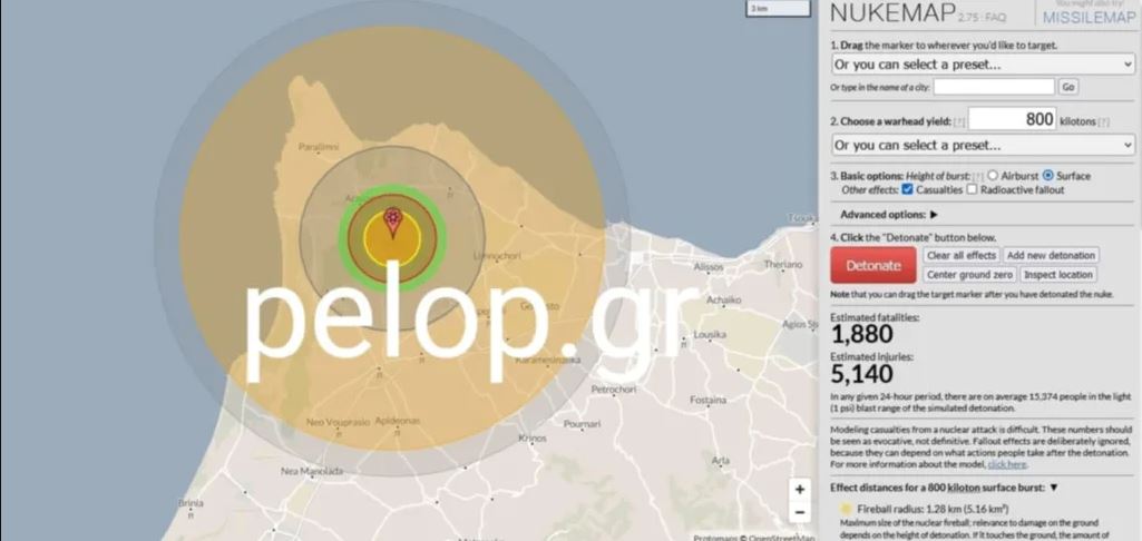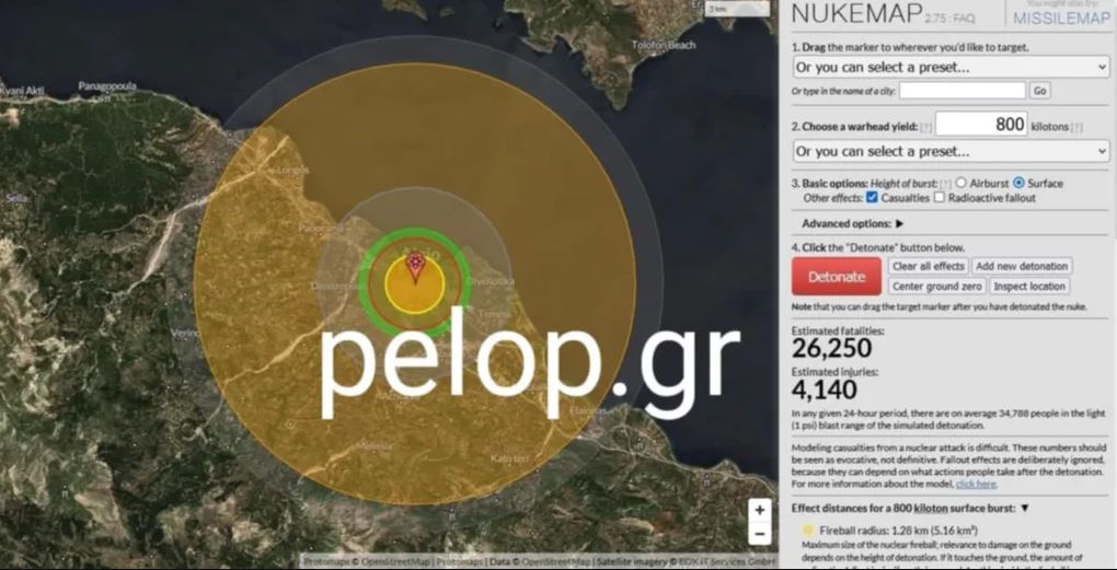 Η εφημερίδα «Πελοπόννησος», με τη χρήση κατάλληλου λογισμικού, έκανε προσομοίωση για τις επιπτώσεις ενός πλήγματος με πυρηνικό όπλο «μεσαίας» ισχύος 800 κιλοτόνων. Να ληφθεί υπόψη ότι η βόμβα που έριξαν οι ΗΠΑ στη Χιροσίμα ήταν ισχύος μόλις 20 κιλοτόνων. Τα αποτελέσματα αποτυπώνουν την κόλαση που θα ζήσουν όσοι… επιζήσουν.