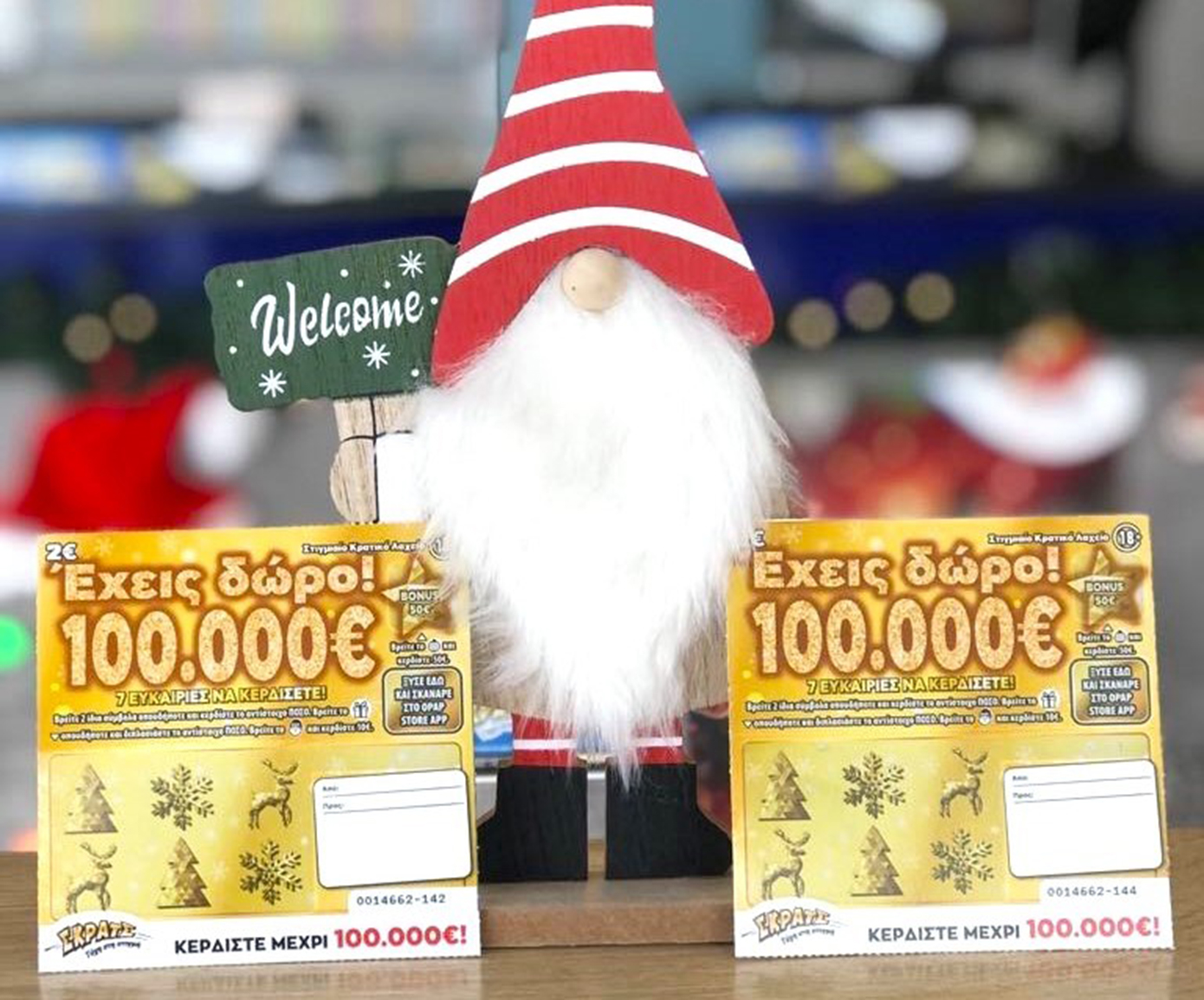 Το παιχνίδι «ΕΧΕΙΣ ΔΩΡΟ! 100.000€» κοστίζει 2 ευρώ και μοιράζει κέρδη έως και 100.000 ευρώ. Στη μέση του λαχνού υπάρχει μια ειδική τσάκιση, ώστε να μπορεί να τοποθετηθεί ως διακοσμητικό ή σαν στολίδι στο δέντρο. Διαθέτει, επίσης, ειδική περιοχή για ευχές.