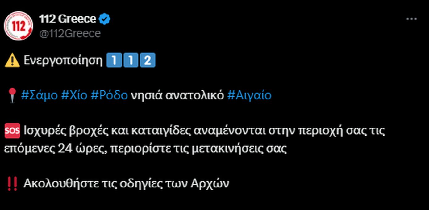 Μήνυμα από το 112 έλαβαν και οι κάτοικοι σε Σάμο και Χίο. «Ισχυρές βροχές και καταιγίδες αναμένονται στην περιοχή σας τις επόμενες 24 ώρες, περιορίστε τις μετακινήσεις σας», αναφέρει το μήνυμα.