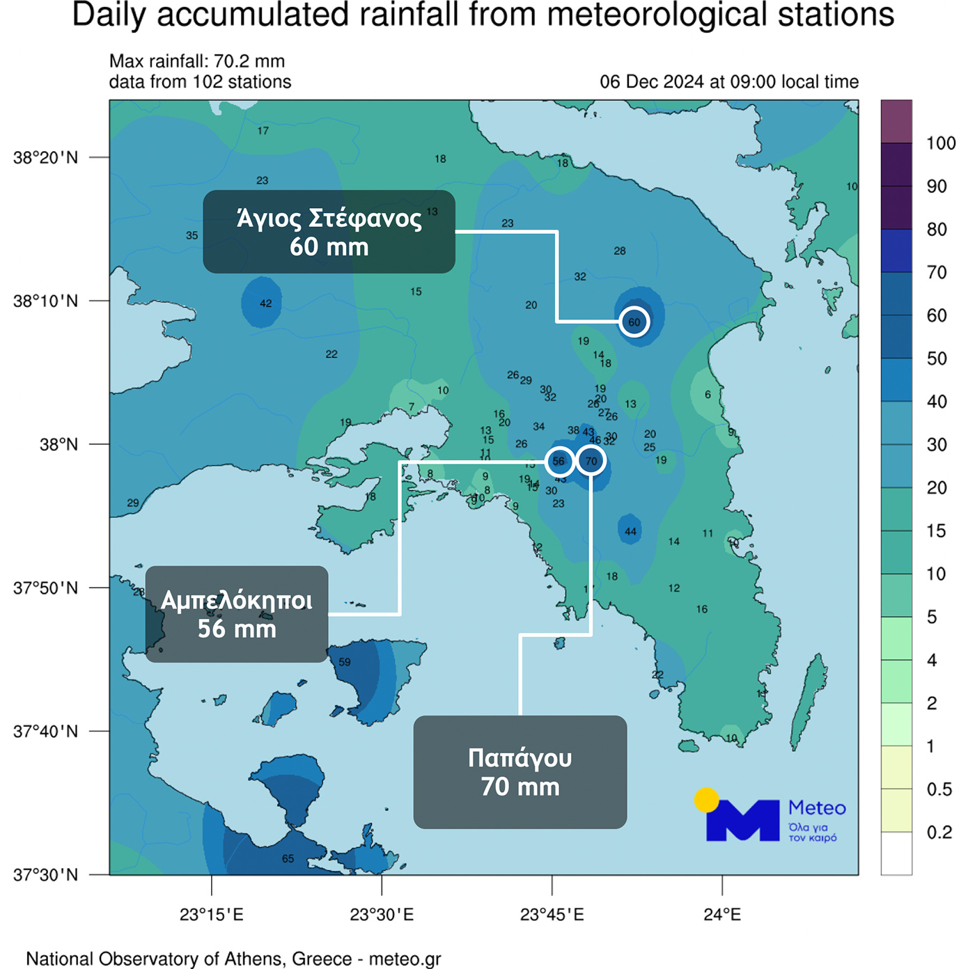 Στον παρακάτω χάρτη παρουσιάζονται τα αθροιστικά ύψη βροχής που έχουν καταγραφεί στο δίκτυο αυτόματων μετεωρολογικών σταθμών του meteo.gr / Εθνικού Αστεροσκοπείου Αθηνών στην ευρύτερη περιοχή της Αττικής έως τις 09:00 της Παρασκευής 06/12.