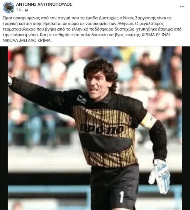 «Είμαι σοκαρισμενος από την στιγμή που το έμαθα. Δυστυχώς ο Νίκος Σαργκανης είναι σε τραγική κατάσταση. Βρίσκεται σε κώμα σε νοσοκομείο των Αθηνών. Ο μεγαλύτερος τερματοφύλακας που βγήκε από το ελληνικό ποδόσφαιρο δυστυχώς χτυπήθηκε άσχημα από την επάρατη νόσο. Και με το θηρίο είναι πολύ δύσκολο να βγεις νικητής. ΚΡΙΜΑ ΡΕ ΦΙΛΕ ΝΙΚΟΛΑ. ΜΕΓΑΛΟ ΚΡΙΜΑ», έγραψε ο έμπειρος αθλητικός δημοσιογράφος.