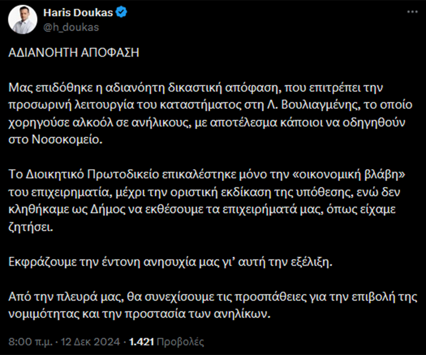 Για «αδιανόητη απόφαση» κάνει λόγο σε σχετική του ανάρτηση στον προσωπικό του λογαριασμό στο Χ ο δήμαρχος Αθηναίων, Χάρης Δούκας και τονίζει: «το Διοικητικό Πρωτοδικείο επικαλέστηκε μόνο την “οικονομική βλάβη” του επιχειρηματία, μέχρι την οριστική εκδίκαση της υπόθεσης, ενώ δεν κληθήκαμε ως Δήμος να εκθέσουμε τα επιχειρήματά μας, όπως είχαμε ζητήσει».