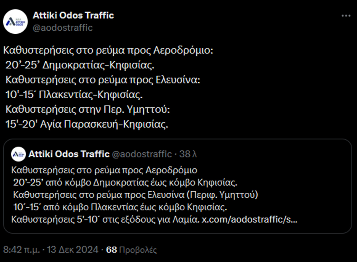 Eιδικότερα στην Αττική Οδό σημειώνονται καθυστερήσεις προς Αεροδρόμιο: 20’-25’ Δημοκρατίας-Κηφισίας. Καθυστερήσεις στο ρεύμα προς Ελευσίνα: 10′-15΄ Πλακεντίας-Κηφισίας. Καθυστερήσεις στην Περ. Υμηττού: 15′-20′ Αγία Παρασκευή-Κηφισίας.