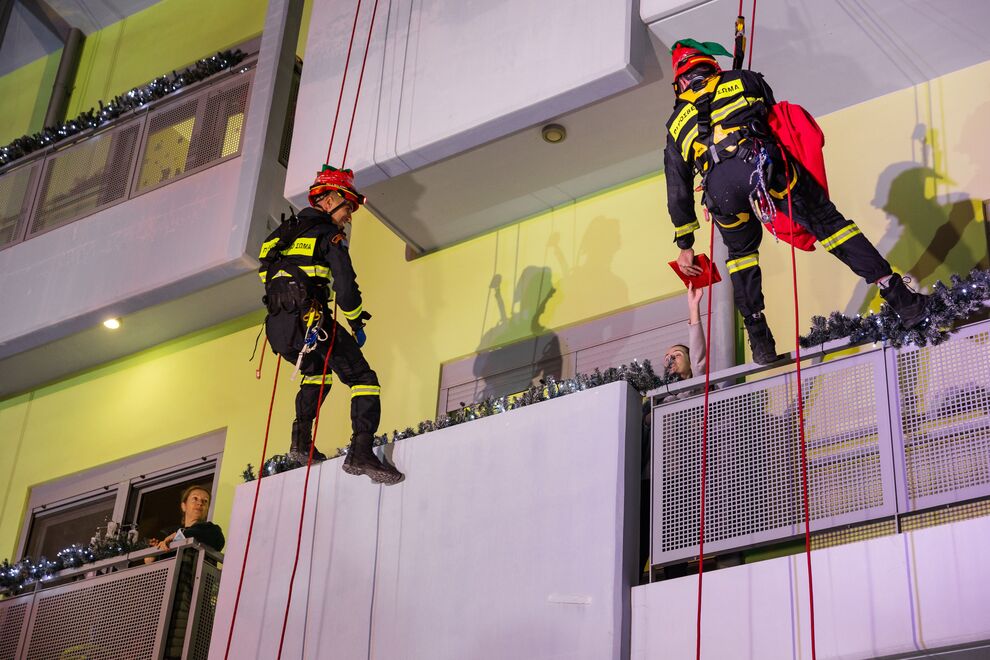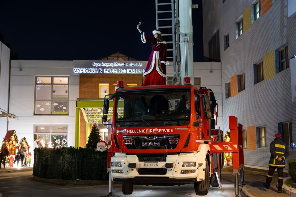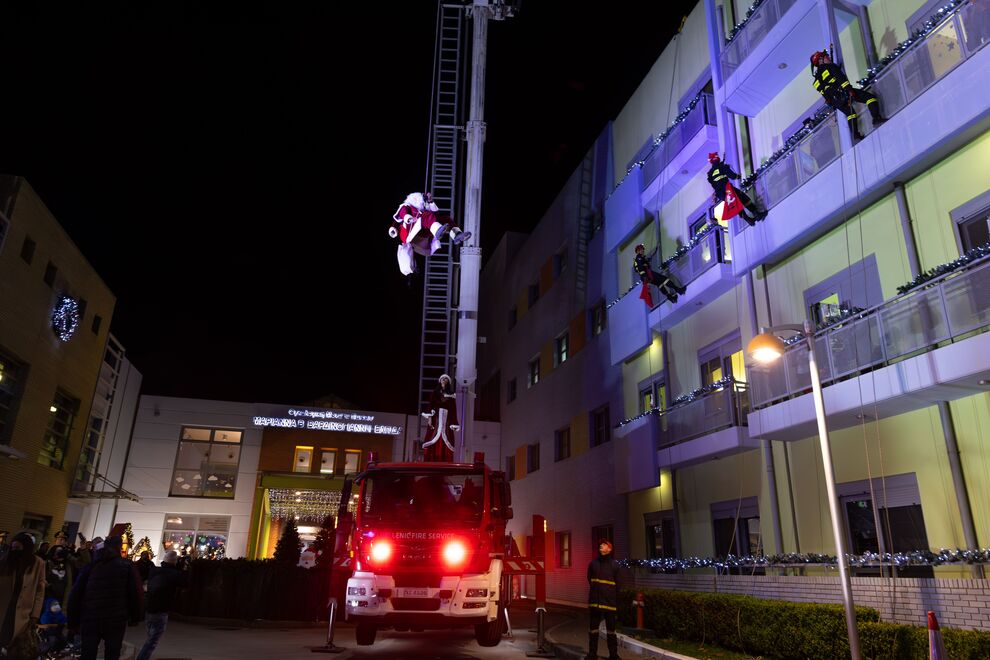 Οι άνδρες της 1ης ΕΜΑΚ μεταμφιέστηκαν σε ιπτάμενους Αγίους Βασίληδες και κατέβηκαν από την οροφή του κτιρίου με σχοινιά, προσφέροντας δώρα στους μικρούς ασθενείς που τους περίμεναν με ανυπομονησία στα παράθυρα και τα μπαλκόνια των δωματίων τους.